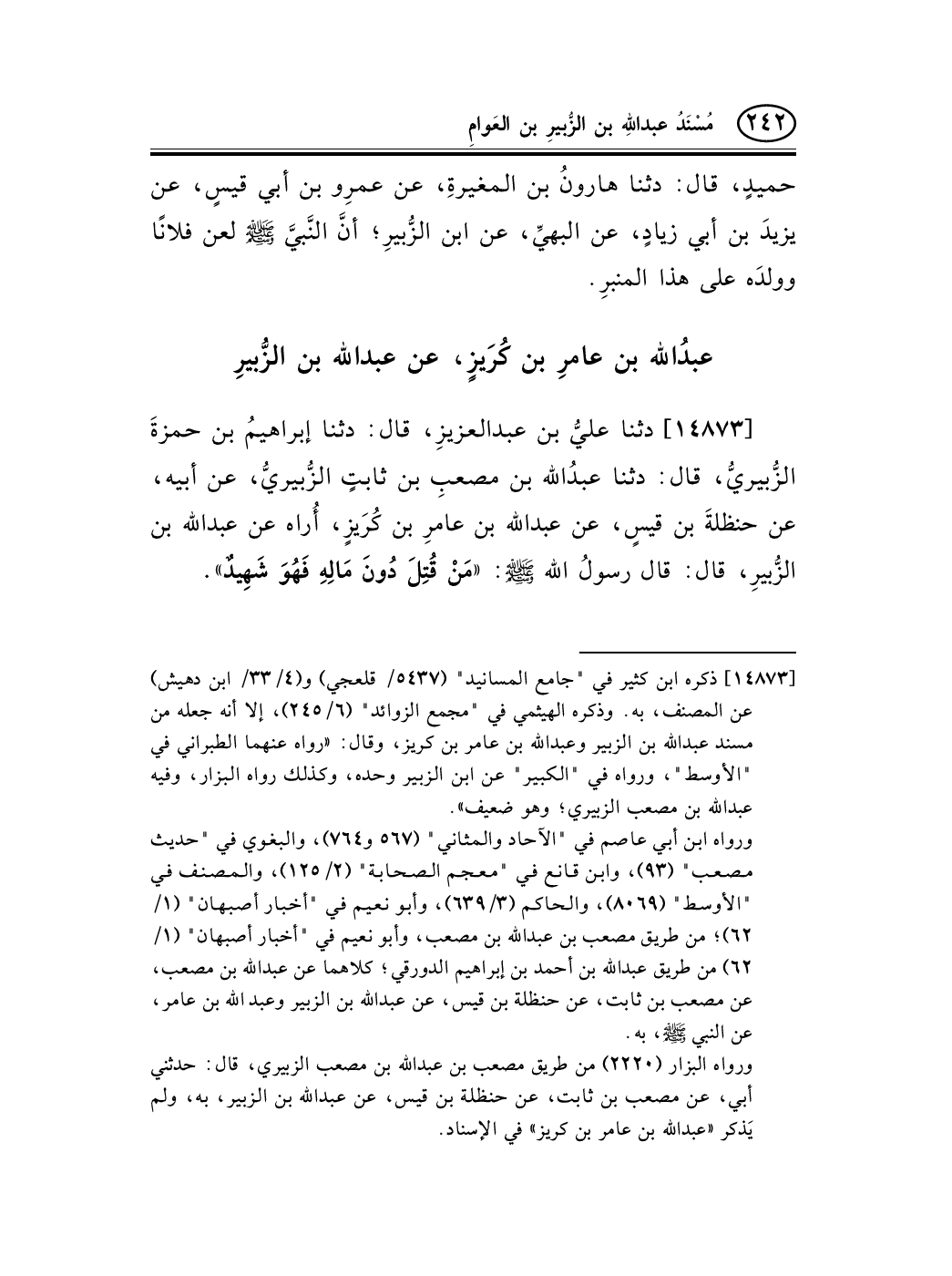 14873 - دثنا عليُّ بن عبد العزيزِ، قال: دثنا إبراهيمُ بن حمزةَ الزُّبيريُّ، قال: دثنا عبدُالله بن مصعبِ بن ثابتٍ الزُّبيريُّ، عن أبيه، عن حنظلةَ بن قيسٍ، عن عبد الله بن عامرِ بن كُرَيزٍ، أُراه عن عبد الله بن الزُّبيرِ، قال: قال رسولُ الله صلى الله عليه وسلم: «مَنْ قُتِلَ دُونَ مَالِهِ فَهُوَ شَهِيدٌ» .