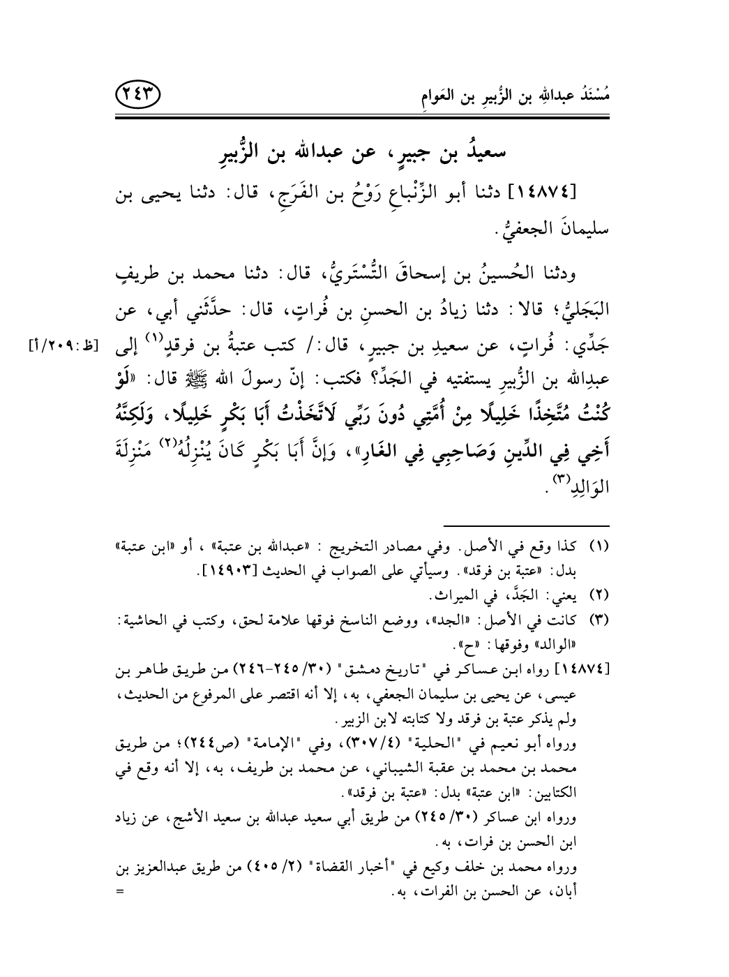 ودثنا الحُسينُ بن إسحاقَ التُّسْتَريُّ، قال: دثنا محمد بن طريفٍ البَجَليُّ؛ قالا: دثنا زيادُ بن الحسنِ بن فُراتٍ، قال: حدَّثَني أبي، عن جَدِّي: فُراتٍ، عن سعيدِ بن جبيرٍ، قال: / كتب عتبةُ بن فرقدٍ (¬1) إلى [ظ: 209/أ] عبدِالله بن الزُّبيرِ يستفتيه في الجَدِّ؟ فكتب: إنّ رسولَ الله صلى الله عليه وسلم قال: «لَوْ كُنْتُ مُتَّخِذًا خَلِيلاً مِنْ أُمَّتِي دُونَ رَبِّي لاَتَّخَذْتُ أَبَا بَكْرٍ خَلِيلاً، وَلَكِنَّهُ أَخِي فِي الدِّينِ وَصَاحِبِي فِي الغَارِ» ، وَإنَّ أَبَا بَكْرٍ كَانَ يُنْزِلُهُ (¬2) مَنْزِلَةَ الوَالِدِ (¬3) .