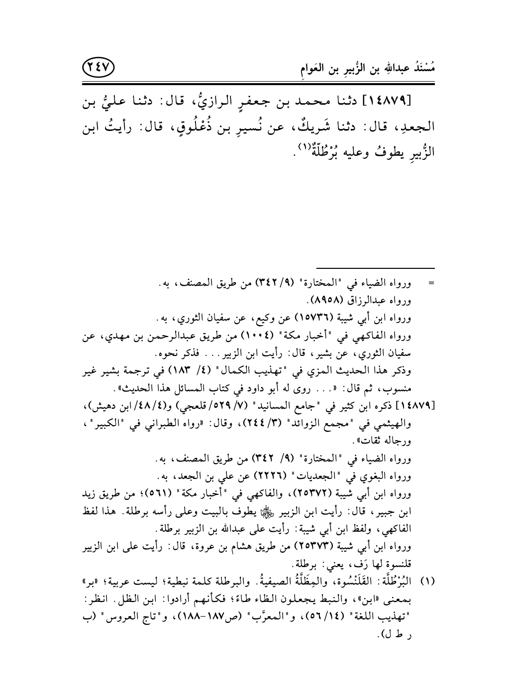 14879 - دثنا محمد بن جعفرٍ الرازيُّ، قال: دثنا عليُّ بن الجعدِ، قال: دثنا شَريكٌ، عن نُسيرِ بن ذُعْلُوقٍ، قال: رأيتُ ابن الزُّبيرِ يطوفُ وعليه بُرْطُلّةٌ (¬1) .