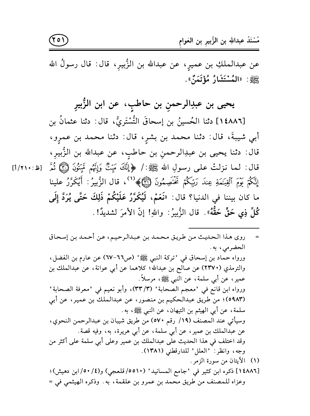 14886 - دثنا الحُسينُ بن إسحاقَ التُّسْتَريُّ، قال: دثنا عثمانُ بن أبي شيبةَ، قال: دثنا محمد بن بشرٍ، قال: دثنا محمد بن عمرٍو، قال: دثنا يحيى بن عبدِالرحمنِ بن حاطبٍ، عن عبد الله بن الزُّبيرِ، قال: لما نزلتْ على رسولِ الله صلى الله عليه وسلم: / {إنك ميت وإنهم ميتون * ثم إنكم يوم القيامة عند ربكم تختصمون} [ظ: 210/أ] (¬1) ، قال الزُّبيرُ: أَيُكَرَّرُ علينا ما كان بيننا في الدنيا؟ قال: «نَعَمْ، لَيُكَرَّرُ عَلَيْكُمْ ذَلِكَ حَتَّى يُرَدَّ إِلَى كُلِّ ذِي حَقٍّ حَقُّهُ» . قال الزُّبيرُ: واللهِ! إنّ الأمرَ لشديدٌ!.