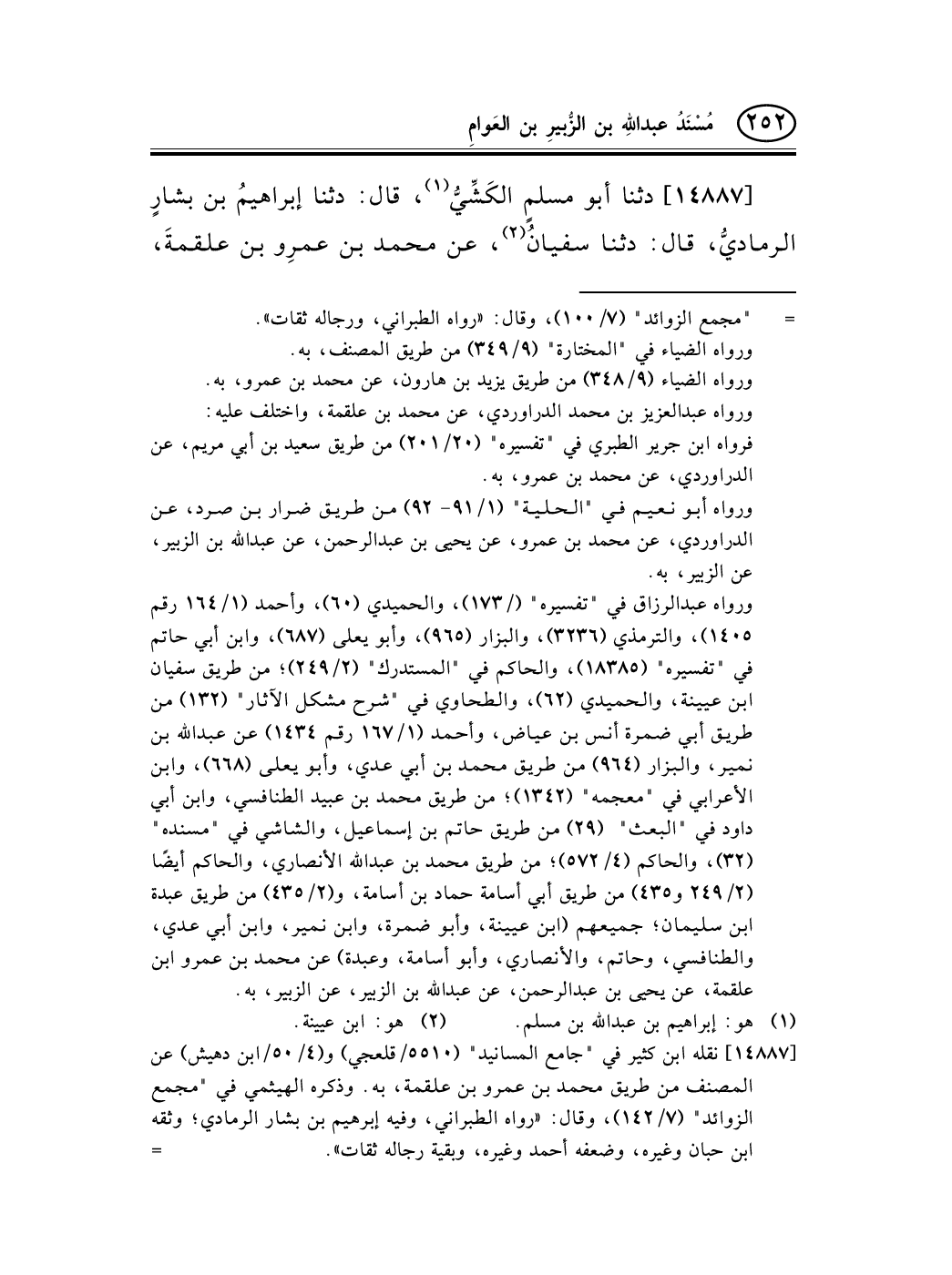 [14887] نقله ابن كثير في "جامع المسانيد" (5510/قلعجي) و (4/50/ابن دهيش) عن المصنف من طريق محمد بن عمرو بن علقمة، به. وذكره الهيثمي في "مجمع الزوائد" (7/142) ، وقال: «رواه الطبراني، وفيه إبرهيم بن بشار الرمادي؛ وثقه ابن حبان وغيره، وضعفه أحمد وغيره، وبقية رجاله ثقات» . -[253]-
