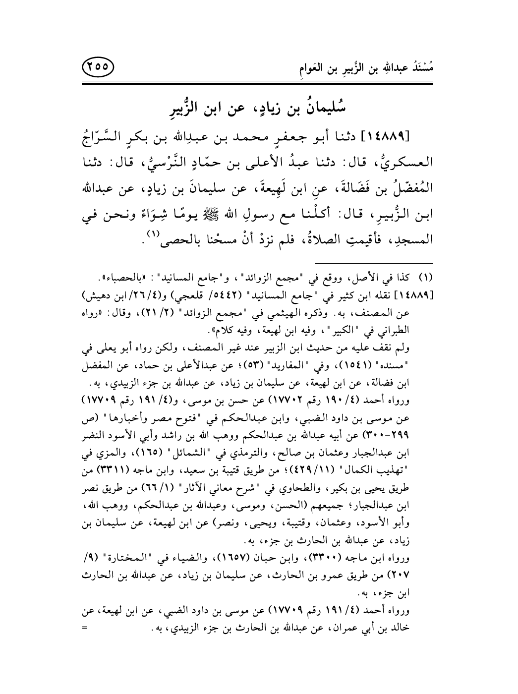 14889 - دثنا أبو جعفرٍ محمد بن عبدِالله بن بكرٍ السَّرّاجُ العسكريُّ، قال: دثنا عبدُ الأعلى بن حمّادٍ النَّرْسيُّ، قال: دثنا المُفضّلُ بن فَضَالةَ، عنِ ابن لَهِيعةَ، عن سليمانَ بن زيادٍ، عن عبد الله ابن الزُّبيرِ، قال: أكلْنا مع رسولِ الله صلى الله عليه وسلم يومًا شِوَاءً ونحن في المسجدِ، فأقيمتِ الصلاةُ، فلم نزدْ أنْ مسحْنا بالحصى (¬1) .