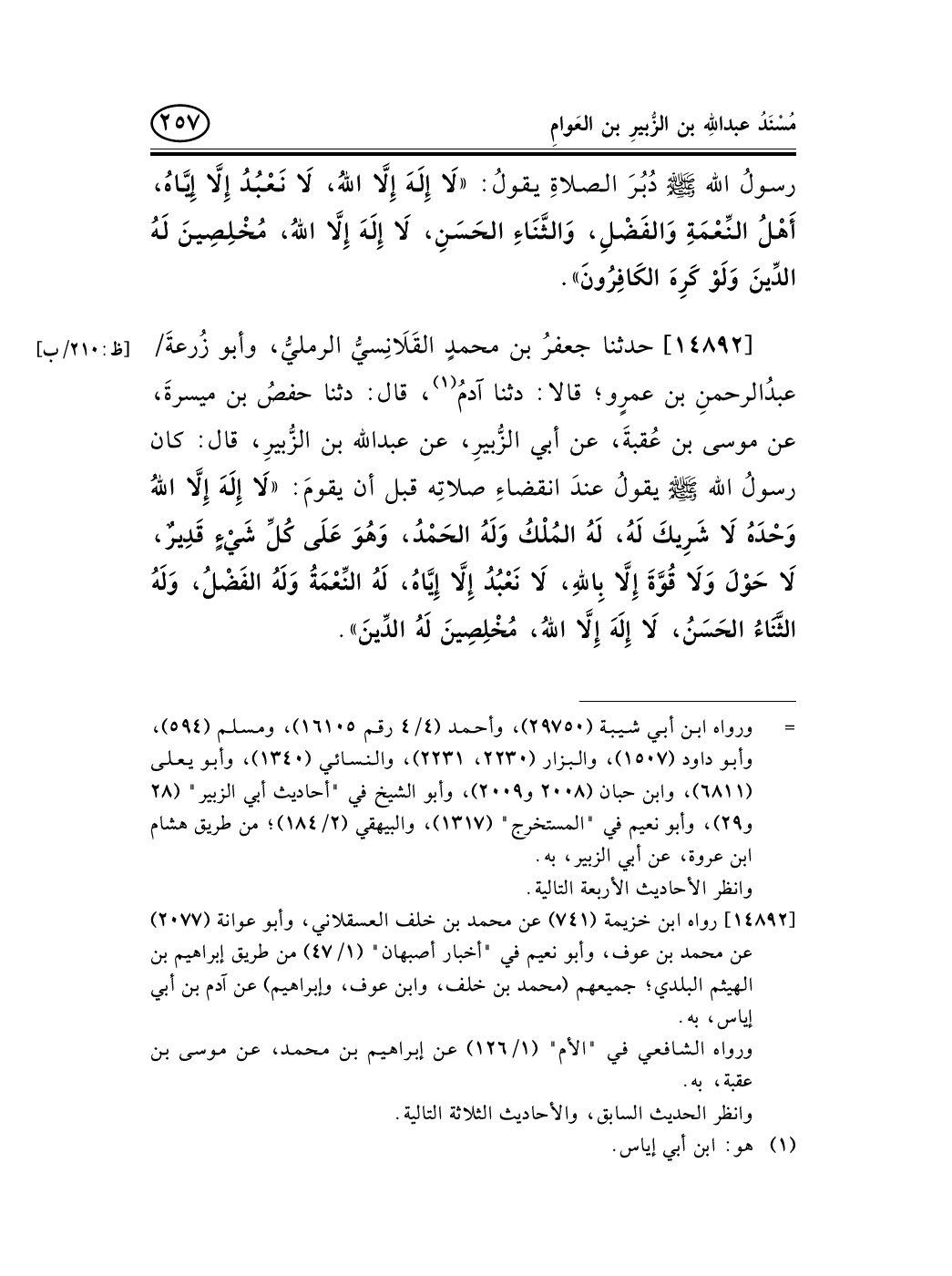 14892 - حدثنا جعفرُ بن محمدٍ القَلاَنِسيُّ الرمليُّ، وأبو زُرعةَ/ عبدُالرحمنِ بن عمرٍو؛ قالا: دثنا آدمُ (¬1) ، قال: دثنا حفصُ بن ميسرةَ، عن موسى بن عُقبةَ، عن أبي الزُّبيرِ، عن عبد الله بن الزُّبيرِ، قال: كان رسولُ الله صلى الله عليه وسلم يقولُ عندَ انقضاءِ صلاتِه قبل أن يقومَ: «لاَ إِلَهَ إِلاَّ اللهُ وَحْدَهُ لاَ شَرِيكَ لَهُ، لَهُ المُلْكُ وَلَهُ الحَمْدُ، وَهُوَ عَلَى كُلِّ شَيْءٍ قَدِيرٌ، لاَ حَوْلَ وَلاَ قُوَّةَ إِلاَّ بِاللهِ، لاَ نَعْبُدُ إِلاَّ إِيَّاهُ، لَهُ النِّعْمَةُ وَلَهُ الفَضْلُ، وَلَهُ الثَّنَاءُ الحَسَنُ، لاَ إِلَهَ إِلاَّ اللهُ، مُخْلِصِينَ لَهُ الدِّينَ» .