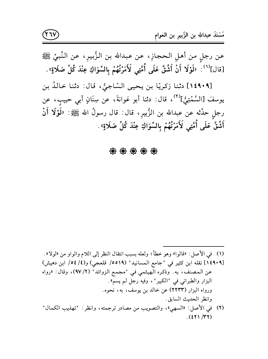 14909 - دثنا زكريّا بن يحيى السّاجيُّ، قال: دثنا خالدُ بن يوسفَ [السَّمْتِيُّ] (¬1) ، قال: دثنا أبو عَوانةَ، عن سِنَانٍ أبي حبيبٍ، عن رجلٍ حدَّثه عن عبد الله بن الزُّبيرِ، قال: قال رسولُ الله صلى الله عليه وسلم: «لَوْلاَ أَنْ أَشُقَّ عَلَى أُمَّتِي لَأَمَرْتُهُمْ بِالسِّوَاكِ عِنْدَ كُلِّ صَلاَةٍ» .