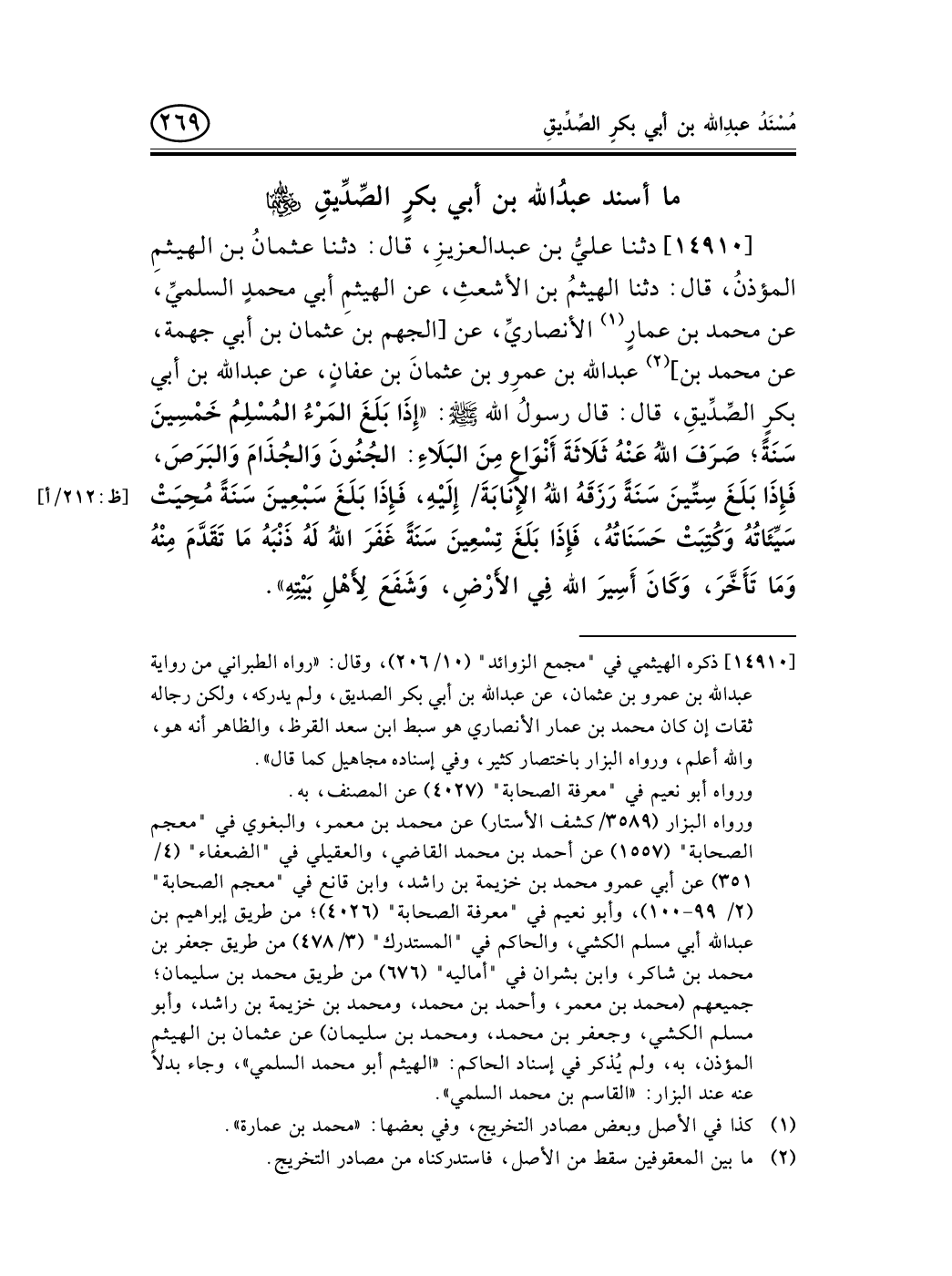 14910 - دثنا عليُّ بن عبد العزيزِ، قال: دثنا عثمانُ بن الهيثمِ المؤذنُ، قال: دثنا الهيثمُ بن الأشعثِ، عن الهيثمِ أبي محمدٍ السلميِّ، عن محمد بن عمارٍ (¬1) الأنصاريِّ، عن [الجهم بن عثمان بن أبي جهمة، عن محمد بن] (¬2) عبد الله بن عمرِو بن عثمانَ بن عفانٍ، عن عبد الله بن أبي بكرٍ الصِّدِّيقِ، قال: قال رسولُ الله صلى الله عليه وسلم: «إِذَا بَلَغَ المَرْءُ المُسْلِمُ خَمْسِينَ سَنَةً؛ صَرَفَ اللهُ عَنْهُ ثَلاَثَةَ أَنْوَاعٍ مِنَ البَلاَءِ: الجُنُونَ وَالجُذَامَ وَالبَرَصَ، فَإِذَا بَلَغَ سِتِّينَ سَنَةً رَزَقَهُ اللهُ الإِنَابَةَ/ إِلَيْهِ، فَإِذَا بَلَغَ سَبْعِينَ سَنَةً مُحِيَتْ [ظ: 212/أ] سَيِّئَاتُهُ وَكُتِبَتْ حَسَنَاتُهُ، فَإِذَا بَلَغَ تِسْعِينَ سَنَةً غَفَرَ اللهُ لَهُ ذَنْبَهُ مَا تَقَدَّمَ مِنْهُ وَمَا تَأَخَّرَ، وَكَانَ أَسِيرَ الله فِي الأَرْضِ، وَشَفَعَ لأَِهْلِ بَيْتِهِ» .
