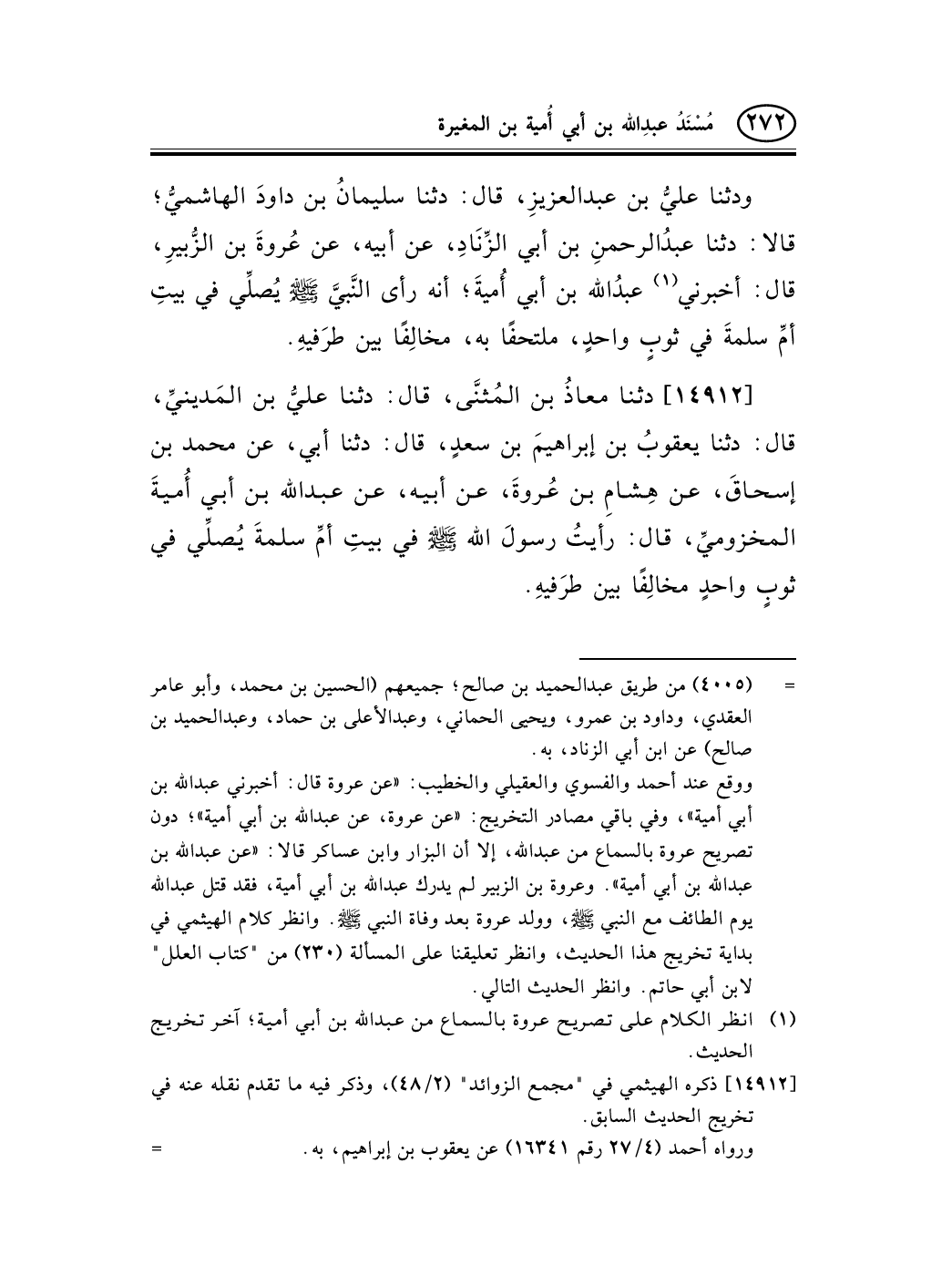 14912 - دثنا معاذُ بن المُثنَّى، قال: دثنا عليُّ بن المَدينيِّ، قال: دثنا يعقوبُ بن إبراهيمَ بن سعدٍ، قال: دثنا أبي، عن محمد بن إسحاقَ، عن هِشامِ بن عُروةَ، عن أبيه، عن عبد الله بن أبي أُميةَ المخزوميِّ، قال: رأيتُ رسولَ الله صلى الله عليه وسلم في بيتِ أمِّ سلمةَ يُصلِّي في ثوبٍ واحدٍ مخالِفًا بين طرَفيهِ.