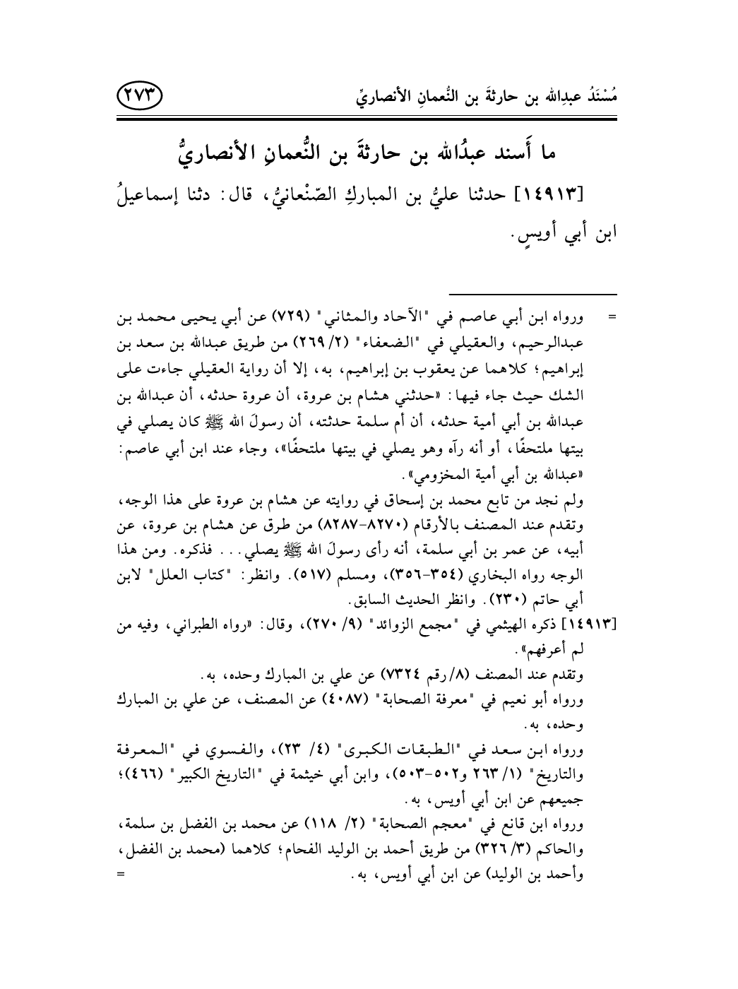14913 - حدثنا عليُّ بن المباركِ الصّنْعانيُّ، قال: دثنا إسماعيلُ ابن أبي أويسٍ. -[274]-