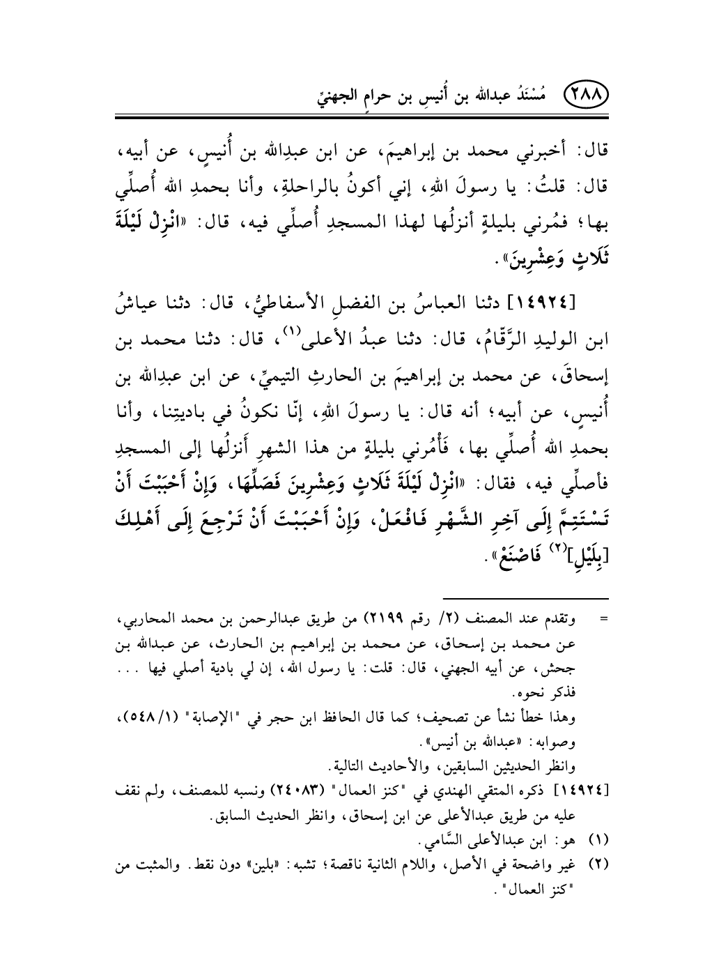 14924 - دثنا العباسُ بن الفضلِ الأسفاطيُّ، قال: دثنا عياشُ ابن الوليدِ الرَّقّامُ، قال: دثنا عبدُ الأعلى (¬1) ، قال: دثنا محمد بن إسحاقَ، عن محمد بن إبراهيمَ بن الحارثِ التيميِّ، عن ابن عبدِالله بن أُنيسٍ، عن أبيه؛ أنه قال: يا رسولَ اللهِ، إنّا نكونُ في باديتِنا، وأنا بحمدِ الله أُصلِّي بها، فَأْمُرني بليلةٍ من هذا الشهرِ أَنزلُها إلى المسجدِ فأصلِّي فيه، فقال: «انْزِلْ لَيْلَةَ ثَلاَثٍ وَعِشْرِينَ فَصَلِّهَا، وَإِنْ أَحْبَبْتَ أَنْ تَسْتَتِمَّ إِلَى آخِرِ الشَّهْرِ فَافْعَلْ، وَإِنْ أَحْبَبْتَ أَنْ تَرْجِعَ إِلَى أَهْلِكَ [بِلَيْلِ] (¬2) فَاصْنَعْ» .