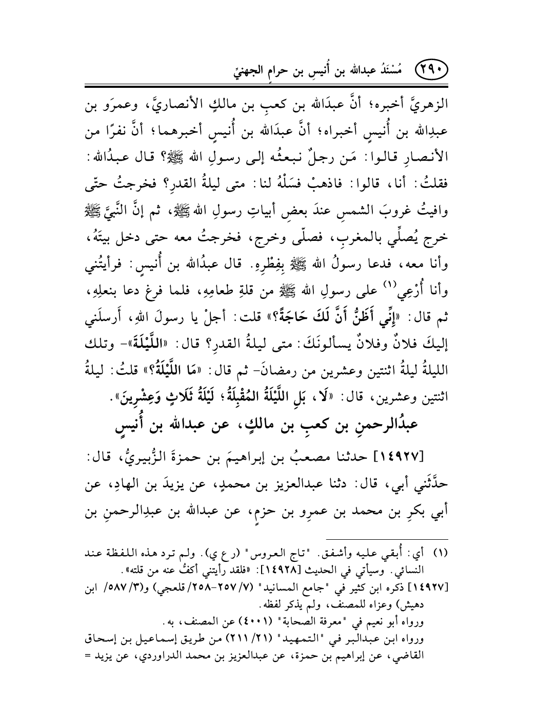 14927 - حدثنا مصعبُ بن إبراهيمَ بن حمزةَ الزُّبيريُّ، قال: حدَّثَني أبي، قال: دثنا عبد العزيز بن محمدٍ، عن يزيدَ بن الهادِ، عن أبي بكرِ بن محمد بن عمرِو بن حزمٍ، عن عبد الله بن عبدِالرحمنِ بن -[291]- كعبِ بن مالكٍ، عن أبيه، عن عبد الله بن أُنيسٍ، قال: كنّا نَتَدارا (¬1) في رمضانَ، فقال قومُنا: إنّه لَيَشقُّ علينا أن ننزلَ بعيالِنا ونسائِنا، وإنا لَنخشى عليهم الضيعةَ إن نزلْنا وتركْناهم، وإنا نكرهُ أن تفوتَنا هذه الليلةُ؛ فهل لكم أن يُرسلَ إلى رسولِ الله صلى الله عليه وسلم ويَذكُرَ هذا له، ويَسألَهُ (¬2) أن يأمرَنا بليلةٍ نَنزلُها؟! قال عبدُالله: فأرسَلوني وكنتُ أَحْدَثَهُمْ، فجئتُ رسولَ الله صلى الله عليه وسلم فذكرتُ له ذلك، وسألتُه أن يأمرَنا بليلةٍ نَنزِلُها، فقال: «انْزِلُوا لَيْلَةَ ثَلاَثٍ وَعِشْرِينَ» . فكان عبدُالله ينزلُ تلك الليلةَ، فإذا أصبح رجع.