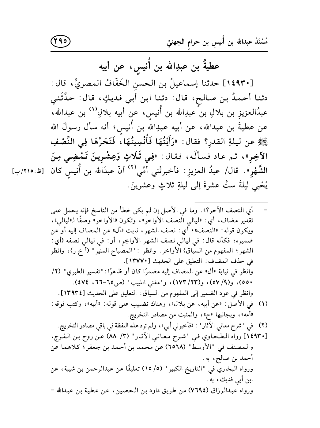 14930 - حدثنا إسماعيلُ بن الحسنِ الخَفّافُ المصريُّ، قال: دثنا أحمدُ بن صالحٍ، قال: دثنا ابن أبي فديكٍ، قال: حدَّثَني عبدُالعزيزِ بن بلالِ بن عبدِالله بن أُنيسٍ، عن أبيه بلالِ (¬1) بن عبد الله، عن عطيةَ بن عبد الله، عن أبيه عبدِالله بن أُنيسٍ؛ أنه سأل رسولَ الله صلى الله عليه وسلم عن ليلةِ القدرِ؟ فقال: «رَأَيْتُهَا فَأُنْسِيتُهَا، فَتَحَرَّهَا فِي النِّصْفِ الآخِرِ» ، ثم عاد فسألَه، فقال: «فِي ثَلاَثٍ وَعِشْرِينَ تَمْضِي مِنَ الشَّهْرِ» . قال/ عبدُ العزيزِ: فأخبرتْني أمِّي (¬2) أنّ عبدَالله بن أُنيسٍ كان [ظ: 215/ب] يُحْيي ليلةَ ستَّ عشرةَ إلى ليلةِ ثلاثٍ وعشرينَ.