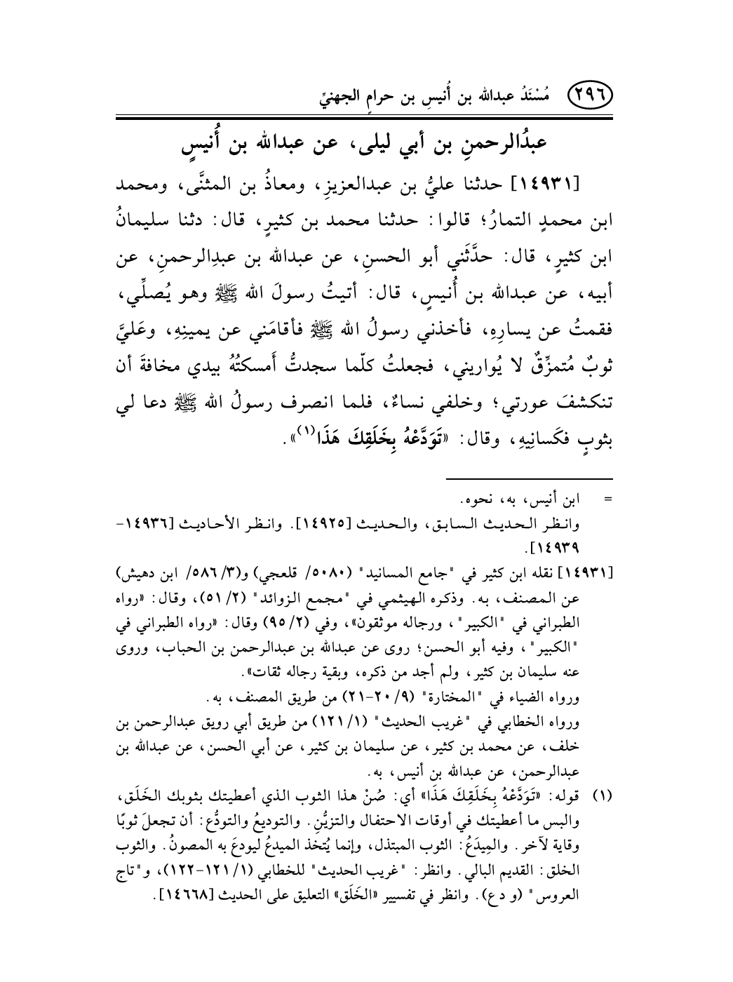 14931 - حدثنا عليُّ بن عبد العزيزِ، ومعاذُ بن المثنَّى، ومحمد ابن محمدٍ التمارُ؛ قالوا: حدثنا محمد بن كثيرٍ، قال: دثنا سليمانُ ابن كثيرٍ، قال: حدَّثَني أبو الحسنِ، عن عبد الله بن عبدِالرحمنِ، عن أبيه، عن عبد الله بن أُنيسٍ، قال: أتيتُ رسولَ الله صلى الله عليه وسلم وهو يُصلِّي، فقمتُ عن يسارِهِ، فأخذني رسولُ الله صلى الله عليه وسلم فأقامَني عن يمينِهِ، وعَليَّ ثوبٌ مُتمزِّقٌ لا يُواريني، فجعلتُ كلّما سجدتُّ أَمسكتُهُ بيدي مخافةَ أن تنكشفَ عورتي؛ وخلفي نساءٌ، فلما انصرف رسولُ الله صلى الله عليه وسلم دعا لي بثوبٍ فكَسانِيهِ، وقال: «تَوَدَّعْهُ بِخَلَقِكَ هَذَا (¬1) » . -[297]-