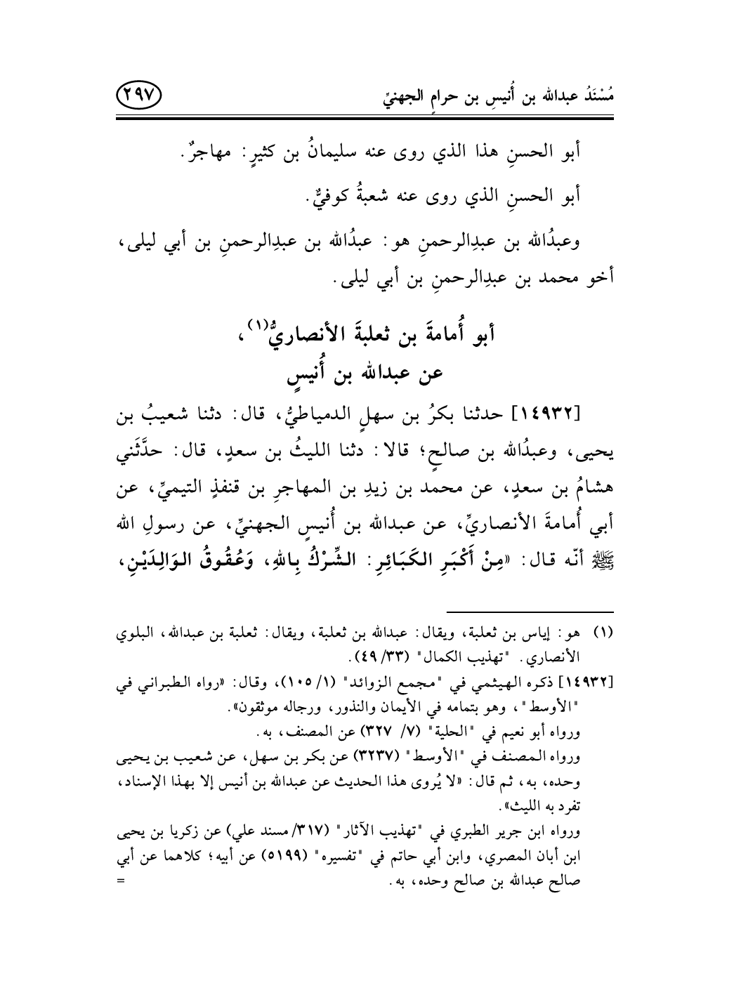 14932 - حدثنا بكرُ بن سهلٍ الدمياطيُّ، قال: دثنا شعيبُ بن يحيى، وعبدُالله بن صالحٍ؛ قالا: دثنا الليثُ بن سعدٍ، قال: حدَّثَني هشامُ بن سعدٍ، عن محمد بن زيدِ بن المهاجرِ بن قنفذٍ التيميِّ، عن أبي أُمامةَ الأنصاريِّ، عن عبد الله بن أُنيسٍ الجهنيِّ، عن رسولِ الله صلى الله عليه وسلم أنّه قال: «مِنْ أَكْبَرِ الكَبَائِرِ: الشِّرْكُ بِاللهِ، وَعُقُوقُ الوَالِدَيْنِ، -[298]- وَاليَمِينُ الغَمُوسُ (¬2) ، وَمَا حَلَفَ حَالِفٌ بِالله يَمِينَ صَبْرٍ أَدْخَلَ فِيهَا مِثْلَ جَنَاحِ بَعُوضَةٍ، إِلاَّ كَانَتْ وَكْتَةً (¬3) فِي قَلْبِهِ إِلَى يَوْمِ القِيَامَةِ» .