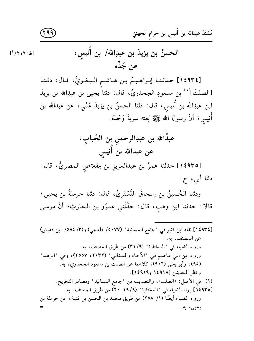14934 - حدثنا إبراهيمُ بن هاشمٍ البغويُّ، قال: دثنا [الصلتُ] (¬1) بن مسعودٍ الجحدريُّ، قال: دثنا يحيى بن عبدِالله بن يزيدَ ابن عبدِالله بن أُنيسٍ، قال: دثنا الحسنُ بن يزيدَ عَمِّي، عن عبد الله بن أُنيسٍ؛ أنّ رسولَ الله صلى الله عليه وسلم بَعثه سريةً وَحْدَهُ.