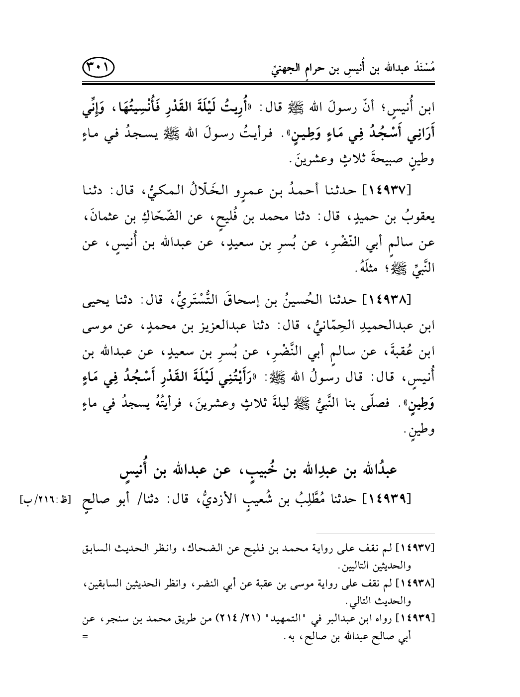 14938 - حدثنا الحُسينُ بن إسحاقَ التُّسْتَريُّ، قال: دثنا يحيى ابن عبد الحميدِ الحِمّانيُّ، قال: دثنا عبد العزيز بن محمدٍ، عن موسى ابن عُقبةَ، عن سالمٍ أبي النَّضْرِ، عن بُسرِ بن سعيدٍ، عن عبد الله بن أُنيسٍ، قال: قال رسولُ الله صلى الله عليه وسلم: «رَأَيْتُنِي لَيْلَةَ القَدْرِ أَسْجُدُ فِي مَاءٍ وَطِينٍ» . فصلّى بنا النَّبيُّ صلى الله عليه وسلم ليلةَ ثلاثٍ وعشرينَ، فرأيتُهُ يسجدُ في ماءٍ وطينٍ.