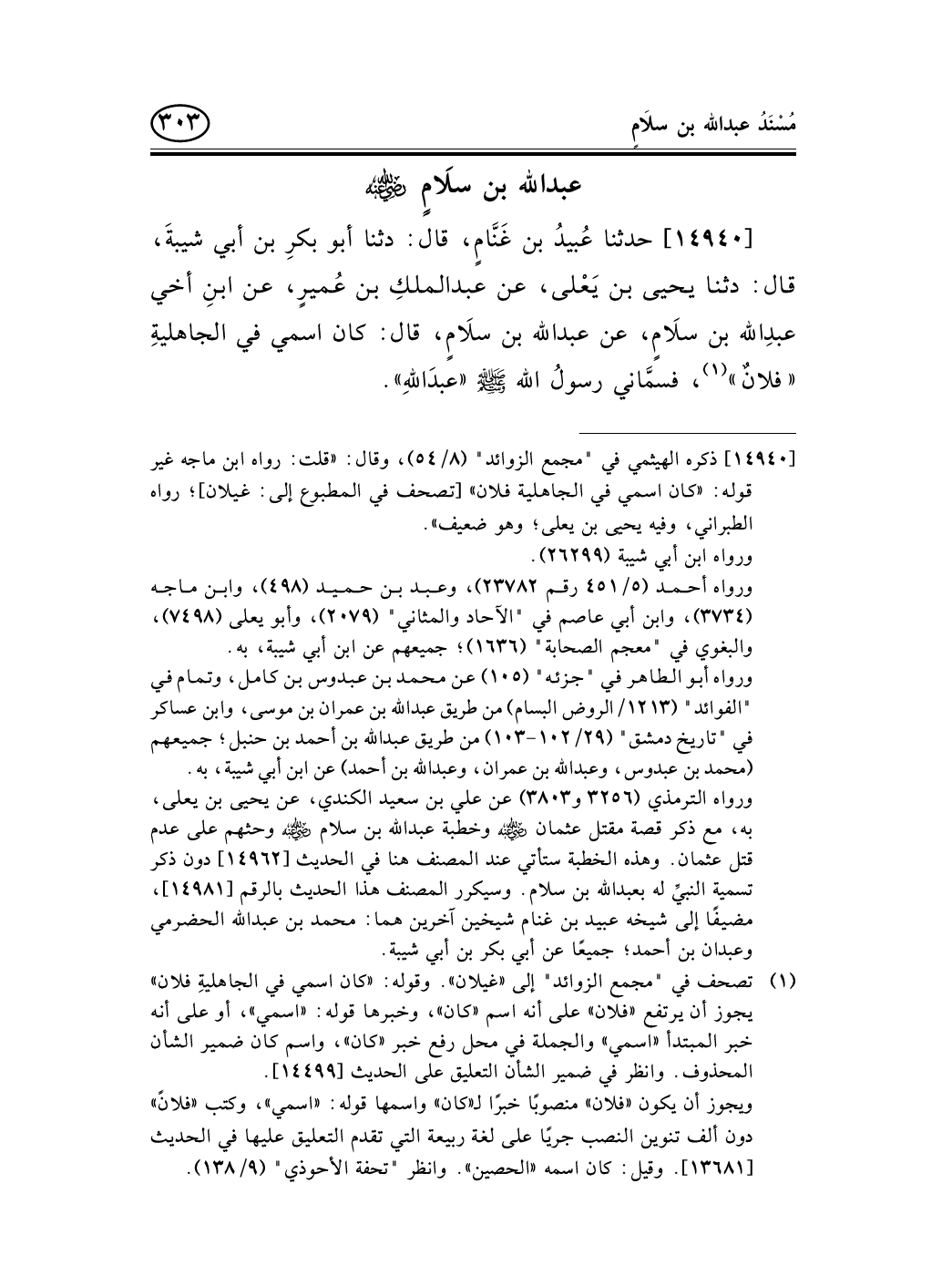 14940 - حدثنا عُبيدُ بن غَنَّامٍ، قال: دثنا أبو بكرِ بن أبي شيبةَ، قال: دثنا يحيى بن يَعْلى، عن عبد الملكِ بن عُميرٍ، عن ابنِ أخي عبدِالله بن سلاَمٍ، عن عبد الله بن سلاَمٍ، قال: كان اسمي في الجاهليةِ «فلانٌ» (¬1) ، فسمَّاني رسولُ الله صلى الله عليه وسلم «عبدَاللهِ» .