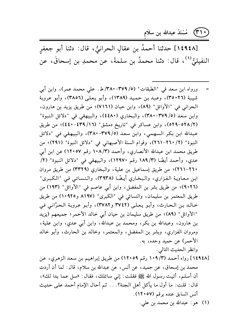 [14948] رواه أحمد (3/109 رقم 12059) من طريق إبراهيم بن سعد الزهري، عن محمد بن إسحاق، عن حميد، عن أنس، عن عبد الله بن سلام، قال: لما أن أردت أن أسلم، أتيت رسول الله صلى الله عليه وسلم فقلت: إني سائلك، فقال: «سل عما بدا لك» ، قال: قلت: ما أول ما يأكل أهل الجنة؟ ... ثم أحال الإمام أحمد على حديث أنس السابق عنده برقم (12057) .