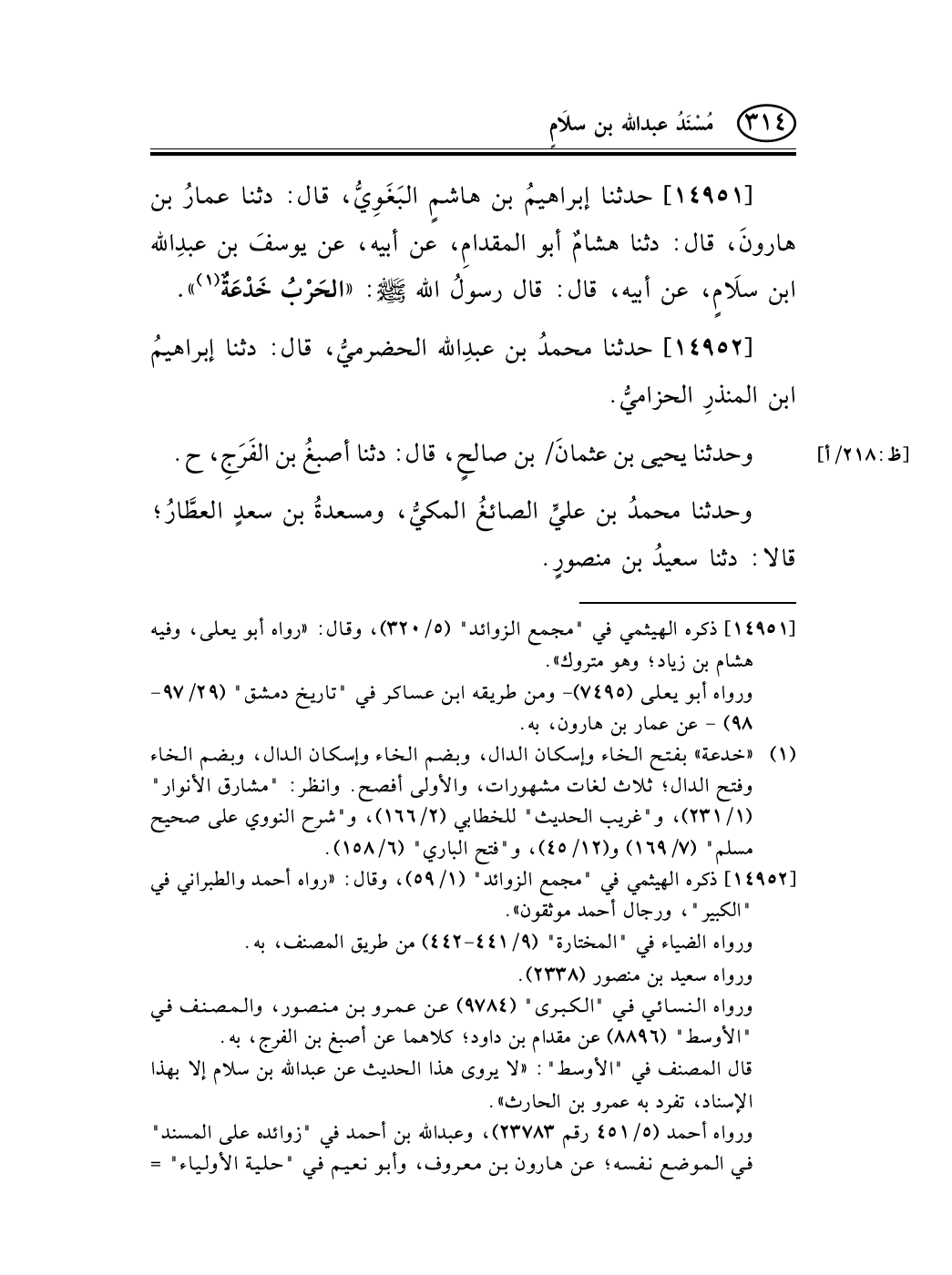 14951 - حدثنا إبراهيمُ بن هاشمٍ البَغَوِيُّ، قال: دثنا عمارُ بن هارونَ، قال: دثنا هشامٌ أبو المقدامِ، عن أبيه، عن يوسفَ بن عبدِالله ابن سلاَمٍ، عن أبيه، قال: قال رسولُ الله صلى الله عليه وسلم: «الحَرْبُ خَدْعَةٌ (¬1) » .