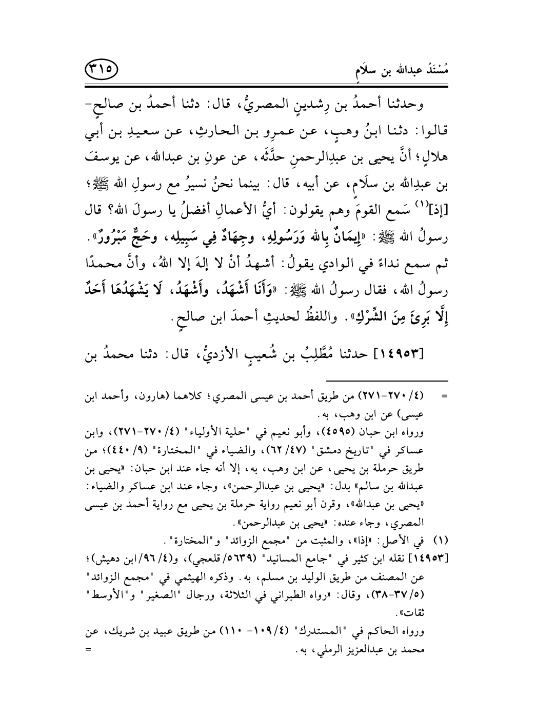 ورواه الحاكم في "المستدرك" (4/109- 110) من طريق عبيد بن شريك، عن محمد بن عبد العزيز الرملي، به. -[316]-