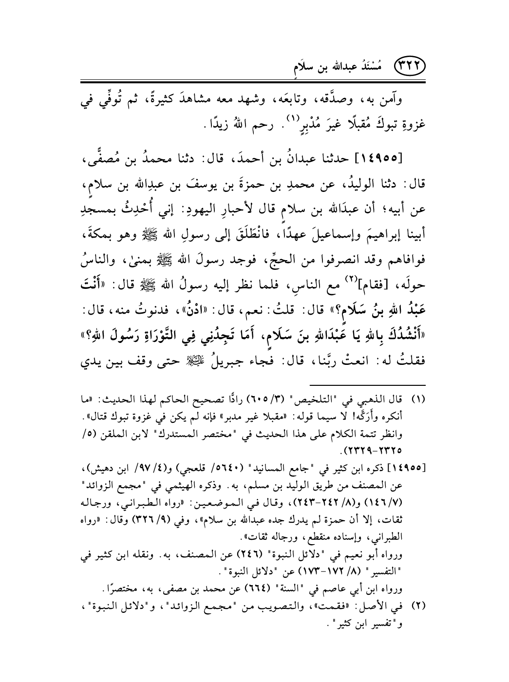 14955 - حدثنا عبدانُ بن أحمدَ، قال: دثنا محمدُ بن مُصفًّى، قال: دثنا الوليدُ، عن محمدِ بن حمزةَ بن يوسفَ بن عبدِالله بن سلامٍ، عن أبيه؛ أن عبدَالله بن سلامٍ قال لأحبارِ اليهودِ: إني أُحْدِثُ بمسجدِ أبينا إبراهيمَ وإسماعيلَ عهدًا، فانْطَلَقَ إلى رسولِ الله صلى الله عليه وسلم وهو بمكةَ، فوافاهم وقد انصرفوا من الحجِِّ، فوجد رسولَ الله صلى الله عليه وسلم بمنى، والناسُ حولَه، [فقام] (¬1) مع الناسِ، فلما نظر إليه رسولُ الله صلى الله عليه وسلم قال: «أَنْتَ عَبْدُ اللهِ بنُ سَلاَمٍ؟» قال: قلتُ: نعم، قال: «ادْنُ» ، فدنوتُ منه، قال: «أَنْشُدُكَ بِاللهِ يَا عَبْدَاللهِ بنَ سَلاَمٍ، أَمَا تَجِدُنِي فِي التَّوْرَاةِ رَسُولَ اللهِ؟» فقلتُ له: انعتْ ربَّنا، قال: فجاء جبريلُ عليه السلام حتى وقف بين يدي -[323]- رسولِ الله صلى الله عليه وسلم فقال (¬2) : {قُلْ هُوَ اللَّهُ أَحَدٌ *اللَّهُ الصَمَدُ *لَمْ يَلِدْ وَلَمْ يُولَدْ *وَلَمْ يَكُنْ لَهُ كُفُوًا أَحَدٌ *} ، فقرأها علينا رسولُ الله صلى الله عليه وسلم. قال ابنُ سلامٍ: أشهدُ أن لا إله إلا الله، وأنك رسولُ الله. ثم انصرف ابنُ سلامٍ إلى المدينةِ، فكتم إسلامَهُ.