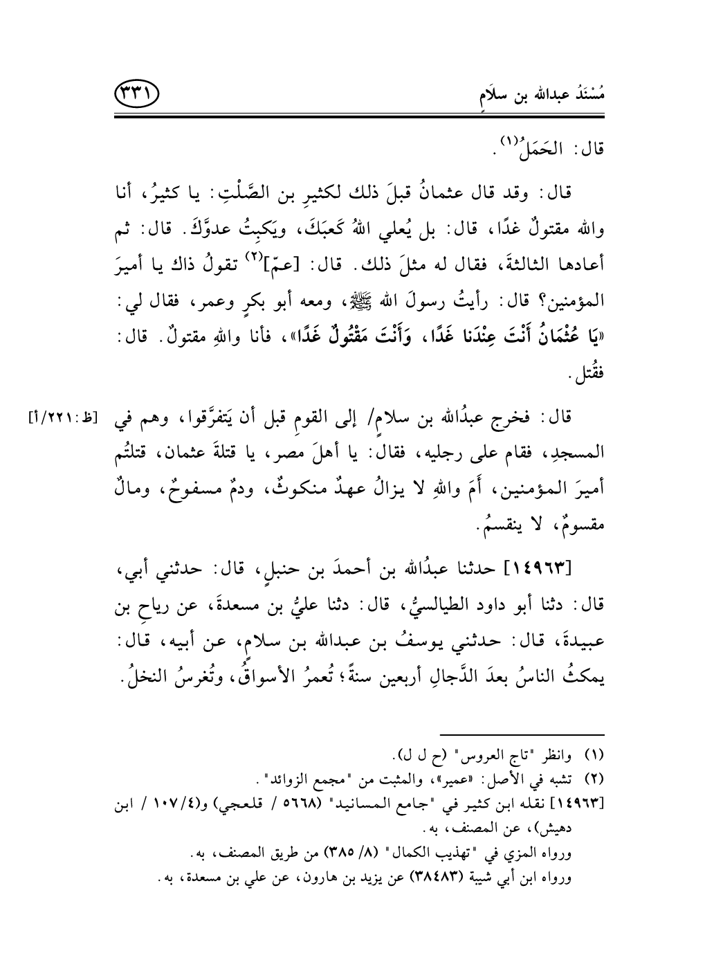 14963 - حدثنا عبدُالله بن أحمدَ بن حنبلٍ، قال: حدثني أبي، قال: دثنا أبو داود الطيالسيُّ، قال: دثنا عليُّ بن مسعدةَ، عن رياحِ بن عبيدةَ، قال: حدثني يوسفُ بن عبد الله بن سلامٍ، عن أبيه، قال: يمكثُ الناسُ بعدَ الدَّجالِ أربعين سنةً؛ تُعمرُ الأسواقُ، وتُغرسُ النخلُ.