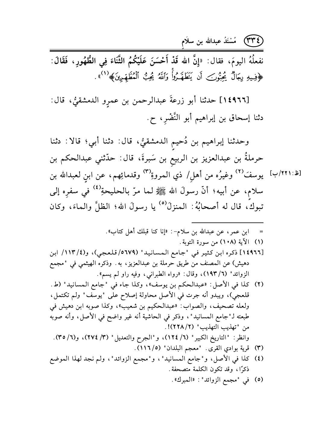 وحدثنا إبراهيم بن دُحيمٍ الدمشقيُّ، قال: دثنا أبي؛ قالا: دثنا حرملةُ بن عبد العزيز بن الربيعِ بن سَبرةَ، قال: حدّثني عبد الحكم بن يوسفَ (¬1) وغيرُه من أهلِ/ ذي المروةِ (¬2) وقدمائِهم، عن ابنٍ لعبد الله بن [ظ: 221/ب]