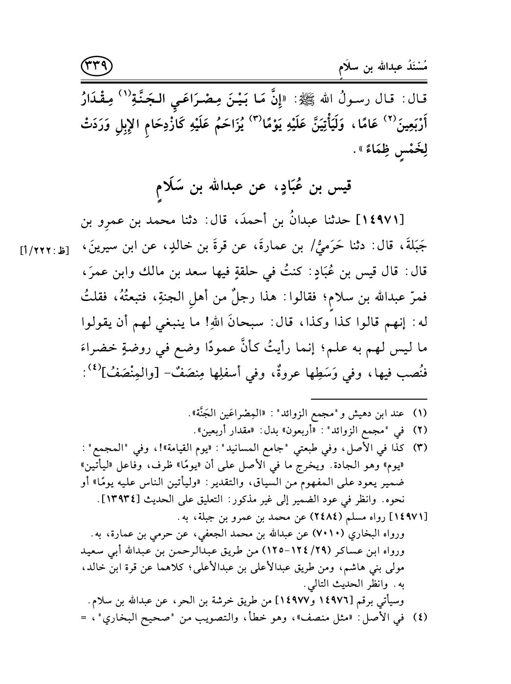 14971 - حدثنا عبدانُ بن أحمدَ، قال: دثنا محمد بن عمرِو بن جَبَلةَ، قال: دثنا حَرَميُّ/ بن عمارةَ، عن قرةَ بن خالدٍ، عن ابن سيرينَ، [ظ: 222/أ] قال: قال قيس بن عُبَادٍ: كنتُ في حلقةٍ فيها سعد بن مالك وابن عمرَ، فمرّ عبد الله بن سلامٍ؛ فقالوا: هذا رجلٌ من أهلِ الجنةِ، فتبعتُهُ، فقلتُ له: إنهم قالوا كذا وكذا، قال: سبحانَ اللهِ! ما ينبغي لهم أن يقولوا ما ليس لهم به علم؛ إنما رأيتُ كأنَّ عمودًا وضع في روضةٍ خضراءَ فنُصب فيها، وفي وَسَطِها عروةٌ، وفي أسفلِها مِنصَفٌ-[والمِنْصَفُ] (¬1) : -[340]- الوصيف- فقيل لي: ارْقَهْ (¬2) ، فرَقِيتُهُ، ثم أخذتُ بالعروةِ. فقصصتُها على رسولِ الله صلى الله عليه وسلم، فقال رسولُ الله صلى الله عليه وسلم: «يَمُوتُ عَبْدُاللهِ بْنُ سَلاَمٍ وَهُوَ آخِذٌ بِالْعُرْوَةِ الوُثْقَى» .