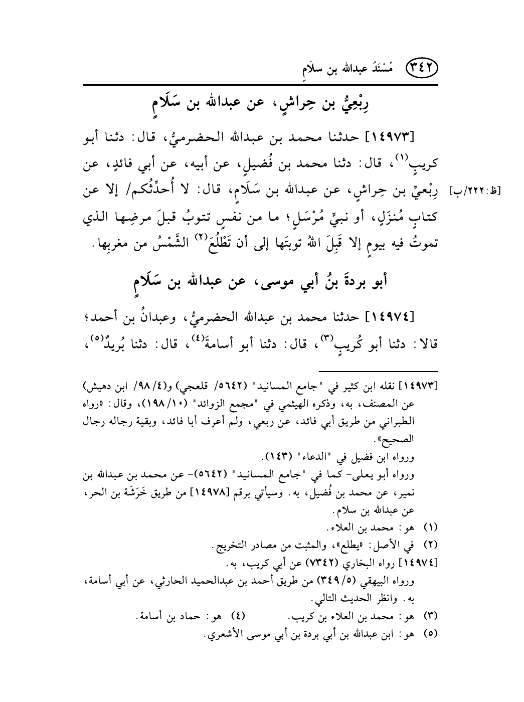 14973 - حدثنا محمد بن عبد الله الحضرميُّ، قال: دثنا أبو كريبٍ (¬1) ، قال: دثنا محمد بن فُضيلٍ، عن أبيه، عن أبي فائدٍ، عن رِبْعيِّ بن حِراشٍ، عن عبد الله بن سَلاَمٍ، قال: لا أُحدِّثُكم/ إلا عن [ظ: 222/ب]