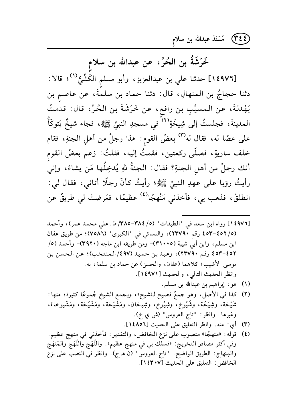 14976 - حدثنا علي بن عبد العزيز، وأبو مسلمٍ الكَشِّيُّ (¬1) ؛ قالا: دثنا حجاجُ بن المنهالِ، قال: دثنا حماد بن سلمةَ، عن عاصمِ بن بَهْدلةَ، عن المسيَّبِ بن رافعٍ، عن خَرَشَةَ بن الحُرِّ، قال: قدمتُ المدينةَ، فجلستُ إلى شِيخَةٍ (¬2) في مسجدِ النبيِّ صلى الله عليه وسلم، فجاء شيخٌ يَتوكّأُ على عصًا له، فقال له (¬3) بعضُ القومِ: هذا رجلٌ من أهلِ الجنةِ، فقام خلف ساريةٍ، فصلّى ركعتين، فقمتُ إليه، فقلتُ: زعم بعضُ القومِ أنك رجلٌ من أهلِ الجنةِ؟ فقال: الجنةُ للهِ يُدخِلُها مَن يشاءُ، وإني رأيتُ رؤيا على عهدِ النبيِّ صلى الله عليه وسلم؛ رأيتُ كأنّ رجلاً أتاني، فقال لي: انطلقْ، فذهب بي، فأخذني مَنْهجًا (¬4) عظيمًا، فعَرضتْ لي طريقٌ عن -[345]- يساري، فأردتُّ أسلُكَُهَا (¬5) ، فقال: إنك لستَ من أهلِها، ثم عَرضتْ لي طريقٌ أخرى عن يَميني، / فسلكتُ حتى انتهيتُ إلى جبلٍ زَلِقٍ، [ظ: 223/أ] فأخذ بيدي فزجل بي (¬6) ، فإذا أنا على ذِ ُرْوتِهِ، فلم أتقارَّ (¬7) ، ولم أتمالكْ، وإذا أنا بعمودٍ في أعلاه عروةٌ من ذهبٍ، فأخذ بيدي فزجل بي، حتى أخذتُ بالعروةِ. فقصصتُها على النبيِّ صلى الله عليه وسلم، فقال: «رَأَيْتَ خَيْرًا؛ أَمَّا المَنْهَجُ العَظِيمُ فَالمَحْشَرُ، وَأَمَّا الطَّرِيقُ الَّتِي عَرَضَتْ (¬8) عَنْ يَسَارِكَ فَطَرِيقُ أَهْلِ النَّارِ، وَلَسْتَ مِن أَهْلِهَا، وَأَمَّا الطَّرِيقُ الَّتِي عَرَضَتْ لَكَ عَنْ يَمِينِكَ فَطَرِيقُ أَهْلِ الجَنَّةِ، وَأَمَّا الجَبَلُ الزَّلِقُ فَمَنْزِلُ الشُّهَدَاءِ، وَأَمَّا العُرْوَةُ الَّتِي اسْتَمْسَكْتَ بِهَا فَعُرْوَةُ الإِسْلاَمِ، وَأَنْتَ مُسْتَمْسِكٌ بِهَا إِنْ شَاءَ اللهُ حَتَّى تَمُوتَ» . وأنا أرجو أن أكونَ من أهلِ الجنةِ. وهو عبد الله بن سلامٍ.
