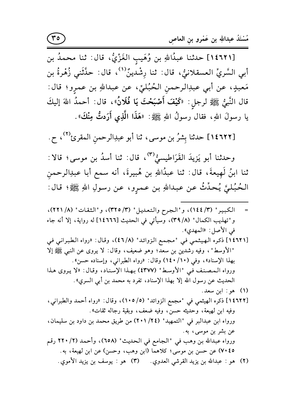 14621 - حدثنا عبدُاللهِ بن وُهَيبٍ الغَزِّيُّ، قال: ثنا محمدُ بن أبي السَّريِّ العسقلانيُّ، قال: ثنا رِشْدينٌ (¬1) ، قال: حدَّثَني زُهْرةُ بن مَعبدٍ، عن أبي عبدِالرحمنِ الحُبُليِّ، عن عبد اللهِ بن عمرٍو؛ قال: قال النَّبيُّ صلى الله عليه وسلم لرجلٍ: «كَيْفَ أَصْبَحْتَ يَا فُلاَنُ» ، قال: أحمدُ اللهَ إليكَ يا رسولَ اللهِ، فقال رسولُ اللهِ صلى الله عليه وسلم: «هَذَا الَّذِي أَرَدتُّ مِنْكَ» .