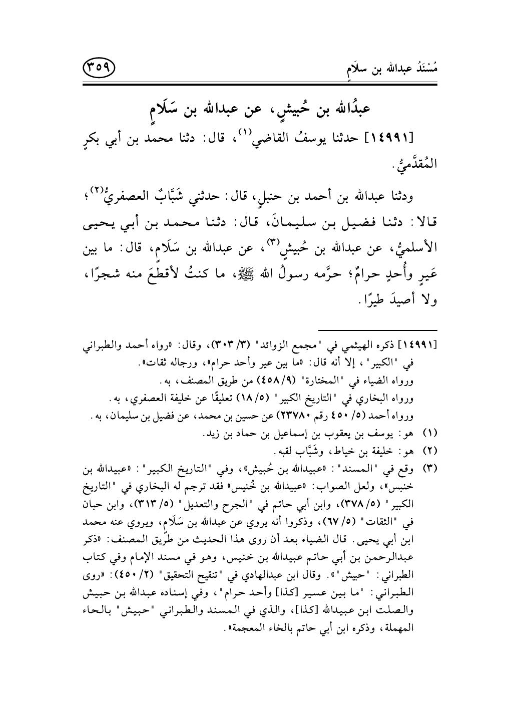 (¬3) وقع في "المسند": «عبيد الله بن حُبيش» ، وفي "التاريخ الكبير": «عبيد الله بن خنبس» ، ولعل الصواب: «عبيد الله بن خُنيس» فقد ترجم له البخاري في "التاريخ الكبير" (5/378) ، وابن أبي حاتم في "الجرح والتعديل" (5/313) ، وابن حبان في "الثقات" (5/67) ، وذكروا أنه يروي عن عبد الله بن سَلاَمٍ، ويروي عنه محمد ابن أبي يحيى. قال الضياء بعد أن روى هذا الحديث من طريق المصنف: «ذكر عبد الرحمن بن أبي حاتم عبيد الله بن خنيس، وهو في مسند الإمام وفي كتاب الطبراني: "حبيش"» . وقال ابن عبد الهادي في "تنقيح التحقيق" (2/450) : «روى الطبراني: "ما بين عسير [كذا] وأحد حرام"، وفي إسناده عبد الله بن حبيش والصلت ابن عبيد الله [كذا] ، والذي في المسند والطبراني "حبيش" بالحاء المهملة، وذكره ابن أبي حاتم بالخاء المعجمة» .