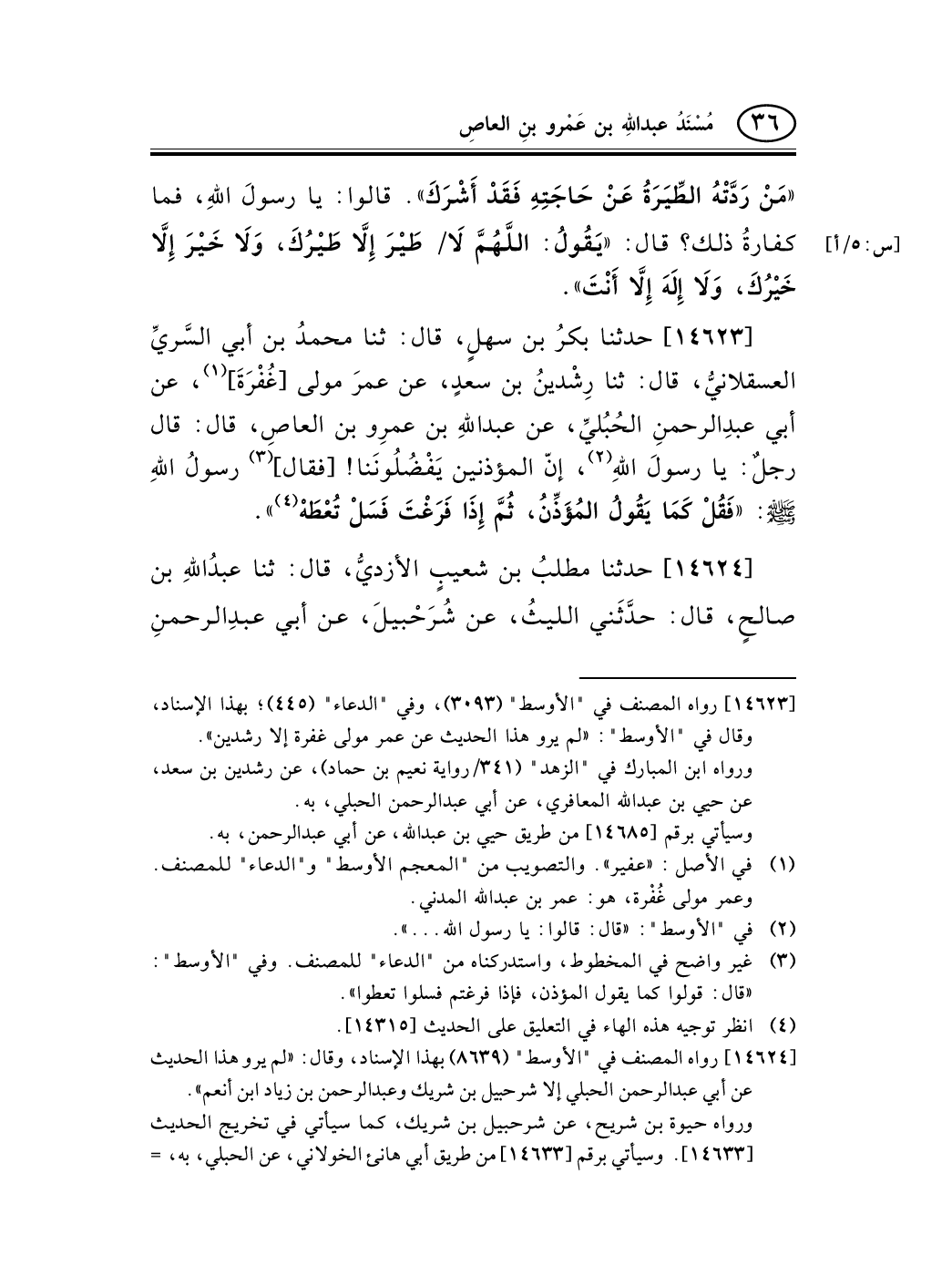 14623 - حدثنا بكرُ بن سهلٍ، قال: ثنا محمدُ بن أبي السَّريِّ العسقلانيُّ، قال: ثنا رِشْدينُ بن سعدٍ، عن عمرَ مولى [غُفْرَةَ] (¬1) ، عن أبي عبدِالرحمنِ الحُبُليِّ، عن عبد اللهِ بن عمرِو بن العاصِ، قال: قال رجلٌ: يا رسولَ اللهِ (¬2) ، إنّ المؤذنين يَفْضُلُونَنا! [فقال] (¬3) رسولُ اللهِ صلى الله عليه وسلم: «فَقُلْ كَمَا يَقُولُ المُؤَذِّنُ، ثُمَّ إِذَا فَرَغْتَ فَسَلْ تُعْطَهْ (¬4) » .