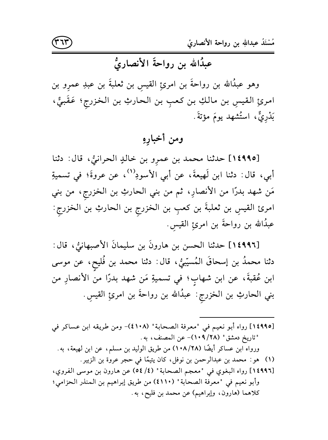 14996 - حدثنا الحسن بن هارونَ بن سليمانَ الأصبهانيُّ، قال: دثنا محمدُ بن إسحاقَ المُسيّبيُّ، قال: دثنا محمد بن فُليحٍ، عن موسى ابن عُقبةَ، عن ابن شهابٍ؛ في تسميةِ مَن شهد بدرًا من الأنصارِ من بني الحارثِ بن الخزرجِ: عبدُالله بن رواحةَ بن امرئِ القيسِ.