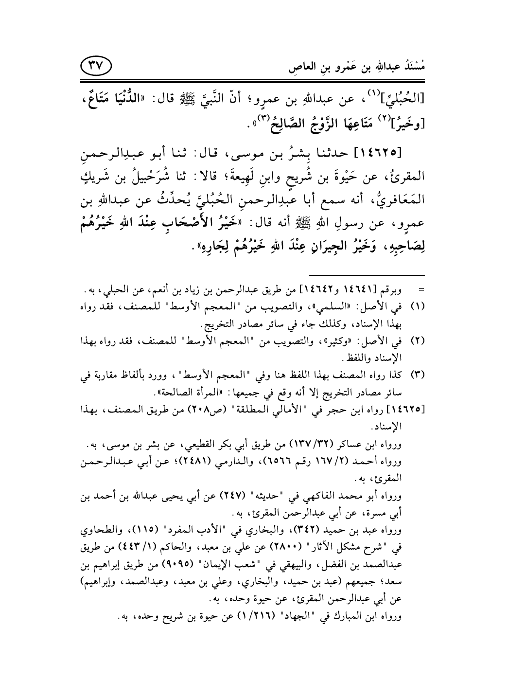 14625 - حدثنا بِشرُ بن موسى، قال: ثنا أبو عبدِالرحمنِ المقرئُ، عن حَيْوةَ بن شُريحٍ وابنِ لَهِيعةَ؛ قالا: ثنا شُرَحْبيلُ بن شَريكٍ المَعَافريُّ، أنه سمع أبا عبدِالرحمنِ الحُبُليَّ يُحدِّثُ عن عبد اللهِ بن عمرٍو، عن رسولِ اللهِ صلى الله عليه وسلم أنه قال: «خَيْرُ الأَصْحَابِ عِنْدَ اللهِ خَيْرُهُمْ لِصَاحِبِهِ، وَخَيْرُ الجِيرَانِ عِنْدَ اللهِ خَيْرُهُمْ لِجَارِهِ» .