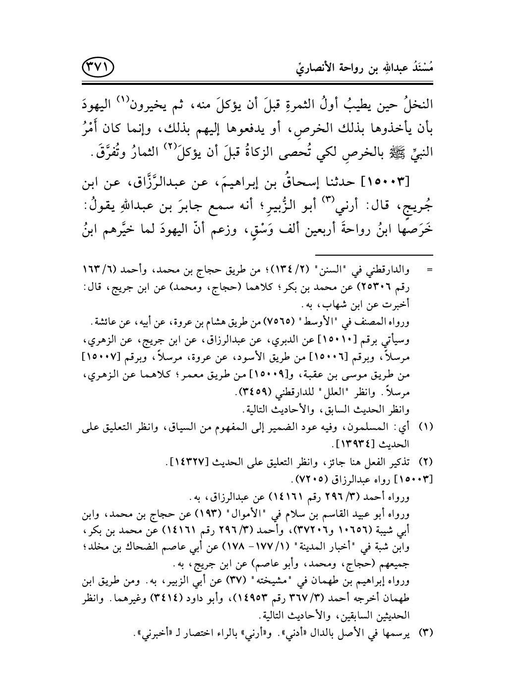 15003 - حدثنا إسحاقُ بن إبراهيمَ، عن عبد الرَّزَّاق، عن ابن جُريجٍ، قال: أرني (¬1) أبو الزُّبيرِ؛ أنه سمع جابرَ بن عبد اللهِ يقولُ: خَرَصها ابنُ رواحةَ أربعين ألف وَسْقٍ، وزعم أنّ اليهودَ لما خيَّرهم ابنُ -[372]- رواحةَ أخذوا التمرَ، وعليهم عشرون ألفَ وَسْقٍ.
