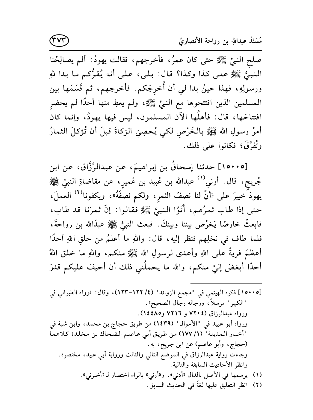 15005 - حدثنا إسحاقُ بن إبراهيمَ، عن عبد الرَّزَّاق، عن ابن جُريجٍ، قال: أرني (¬1) عبد الله بن عُبيد بن عُميرٍ، عن مقاضاةِ النبيِّ صلى الله عليه وسلم يهودَ خيبرَ على «أنّ لنا نصفَ الثمرِ، ولكم نصفَهُ» ، ويكفونا (¬2) العملَ، حتى إذا طاب ثمرُهم، أَتَوُا النبيَّ صلى الله عليه وسلم فقالوا: إنّ ثمرَنا قد طاب، فابعثْ خارصًا يَخرُص بيننا وبينكَ. فبعث النبيُّ صلى الله عليه وسلم عبدَالله بن رواحةَ، فلما طاف في نخلِهم فنظر إليه، قال: واللهِ ما أعلمُ من خلقِ اللهِ أحدًا أعظمَ فريةً على اللهِ وأعدى لرسولِ الله صلى الله عليه وسلم منكم، واللهِ ما خلق اللهُ أحدًا أبغضَ إليَّ منكم، والله ما يحملُني ذلك أن أحيفَ عليكم قدرَ -[374]- مثقالِ ذرةٍ وأنا أعلمُها. قال: ثم خَرَصَها جميعًا، الذي لهم والذي ليهودَ ثمانين ألفَ وَسْقٍ، فقال اليهودُ: حَرَبْتنا (¬3) ، فقال ابنُ رواحةَ: إن شئتم فأعطونا أربعين ألفَ وَسْقٍ، وتخرجون عنا. فنظر بعضُهم إلى بعضٍ، ثم قالوا: بهذا قامتِ السمواتُ والأرضُ، وبهذا يَغلبُونكم.