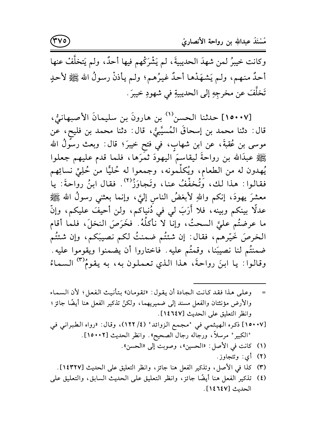 15007 - حدثنا الحسن (¬1) بن هارونَ بن سليمانَ الأصبهانيُّ، قال: دثنا محمد بن إسحاقَ المُسيَّبيُّ، قال: دثنا محمد بن فليحٍ، عن موسى بن عُقبةَ، عن ابن شهابٍ، في فتحِ خيبرَ؛ قال: وبعث رسولُ الله صلى الله عليه وسلم عبدَالله بن رواحةَ ليقاسمَ اليهودَ ثمرَها، فلما قدم عليهم جعلوا يُهدون له من الطعامِ، ويُكلِّمونه، وجمعوا له حُليًّا من حُلِيِّ نسائِهم فقالوا: هذا لك، وتُخفِّفُ عنا، وتَجاوَزُ (¬2) . فقال ابنُ رواحةَ: يا معشرَ يهودَ، إنكم واللهِ لأبغضُ الناسِ إليَّ، وإنما بعثني رسولُ الله صلى الله عليه وسلم عدلاً بينكم وبينه، فلا أَرَبَ لي في دُنياكم، ولن أحيفَ عليكم، وإنّ ما عرضتُم عليَّ السحتُ، وإنا لا نأكلُهُ. فخَرَصَ النخلَ، فلما أقام الخرصَ خَيّرهم، فقال: إن شئتُم ضمنتُ لكم نصيبَكم، وإن شئتُم ضمنتُم لنا نصيبَنا، وقمتُم عليه. فاختاروا أن يضمنوا ويقوموا عليه. وقالوا: يا ابنَ رواحةَ، هذا الذي تعملون به، به يقومُ (¬3) السماءُ -[376]- والأرضُ، وإنما يقومان (¬4) بالحقِّ.