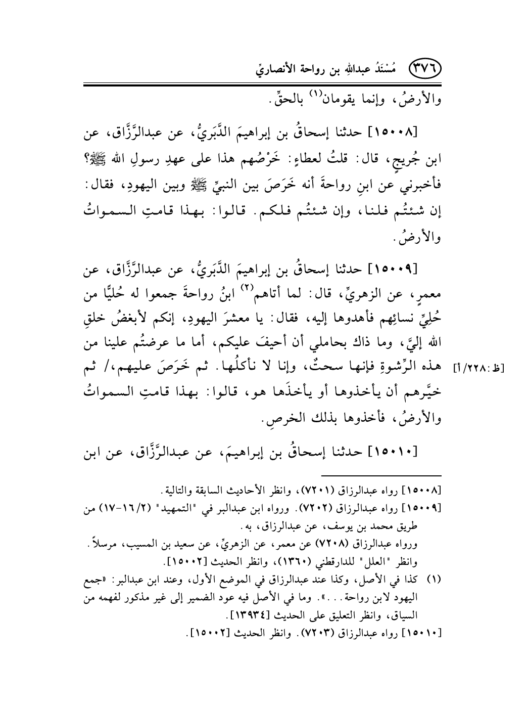 15009 - حدثنا إسحاقُ بن إبراهيمَ الدَّبَريُّ، عن عبد الرَّزَّاق، عن معمرٍ، عن الزهريِّ، قال: لما أتاهم (¬1) ابنُ رواحةَ جمعوا له حُليًّا من حُلِيِّ نسائِهم فأهدوها إليه، فقال: يا معشرَ اليهودِ، إنكم لأبغضُ خلقِ الله إليَّ، وما ذاك بحاملي أن أحيفَ عليكم، أما ما عرضتُم علينا من هذه الرِّشوةِ فإنها سحتٌ، وإنا لا نأكلُها. ثم خَرَصَ عليهم، / ثم [ظ: 228/أ] خيَّرهم أن يأخذوها أو يأخذَها هو، قالوا: بهذا قامتِ السمواتُ والأرضُ، فأخذوها بذلك الخرصِ.