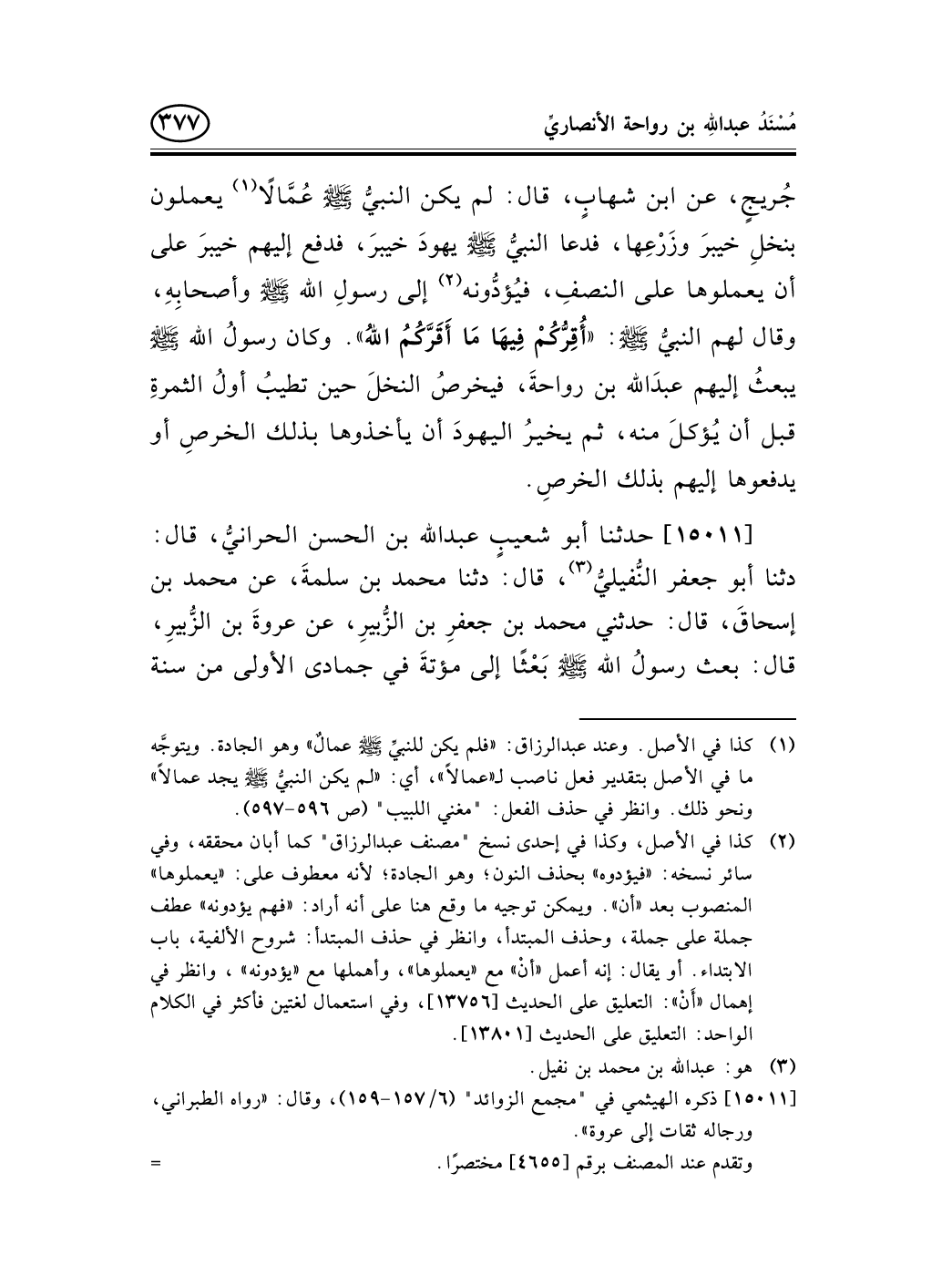 (¬16) سيورد المصنف رحمه الله ما أنشده عبد الله بن رواحة رضي الله عنه في الحديث التالي بإسناد آخر غير إسناد قصة وقعة مؤتة، ثم يستأنف القصة بإسناد هذا الحديث بعد انقضاء قصة إنشاد البيت.