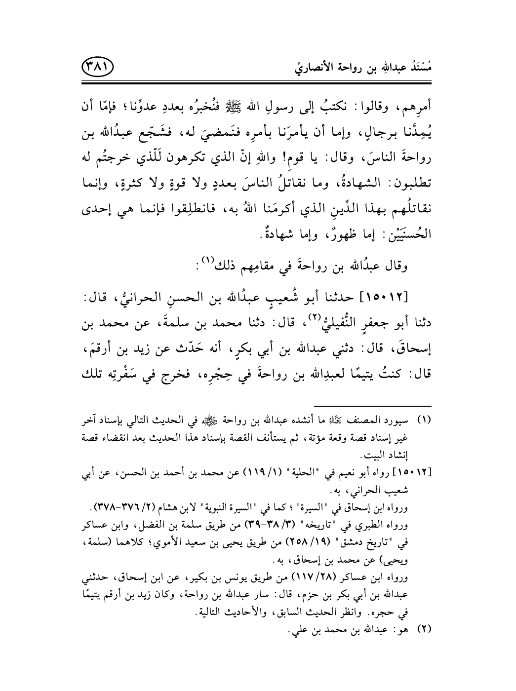 15012 - حدثنا أبو شُعيبٍ عبدُالله بن الحسنِ الحرانيُّ، قال: دثنا أبو جعفرٍ النُّفيليُّ (¬1) ، قال: دثنا محمد بن سلمةَ، عن محمد بن إسحاقَ، قال: دثني عبد الله بن أبي بكرٍ، أنه حَدّث عن زيد بن أرقمَ، قال: كنتُ يتيمًا لعبدِالله بن رواحةَ في حِجْرِه، فخرج في سَفْرتِه تلك -[382]- مُردِفي على حَقيبةِ (¬2) راحلتِهِ، فواللهِ إنا لنَسيرُ ليلةً، إذ سمعتُه يتمثلُ ببيتِه هذا (¬3) :