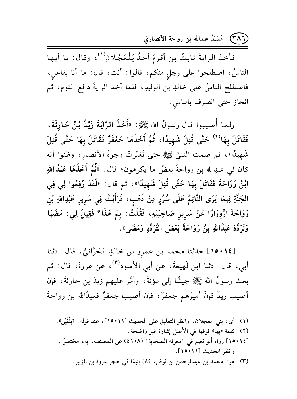15014 - حدثنا محمد بن عمرِو بن خالدٍ الحَرَّانيُّ، قال: دثنا أبي، قال: دثنا ابن لَهيعةَ، عن أبي الأسودِ (¬1) ، عن عروةَ، قال: ثم بعث رسولُ الله صلى الله عليه وسلم جيشًا إلى مؤتةَ، وأمَّر عليهم زيدَ بن حارثةَ، فإن أصيب زيدٌ فإنّ أميرَهم جعفرٌ، فإن أصيب جعفرٌ فعبدُالله بن رواحةَ -[387]- الأنصاريُّ أميرُهم. فخرجوا قِبَلَ الشامِ نحو مؤتةَ، فأصيب أمراؤُهم الذي (¬2) أمّر رسولُ الله صلى الله عليه وسلم، فأخذ خالدُ بن الوليد الرايةَ، فاصطلح المسلمون عليه؛ فهزم اللهُ العدوَّ.