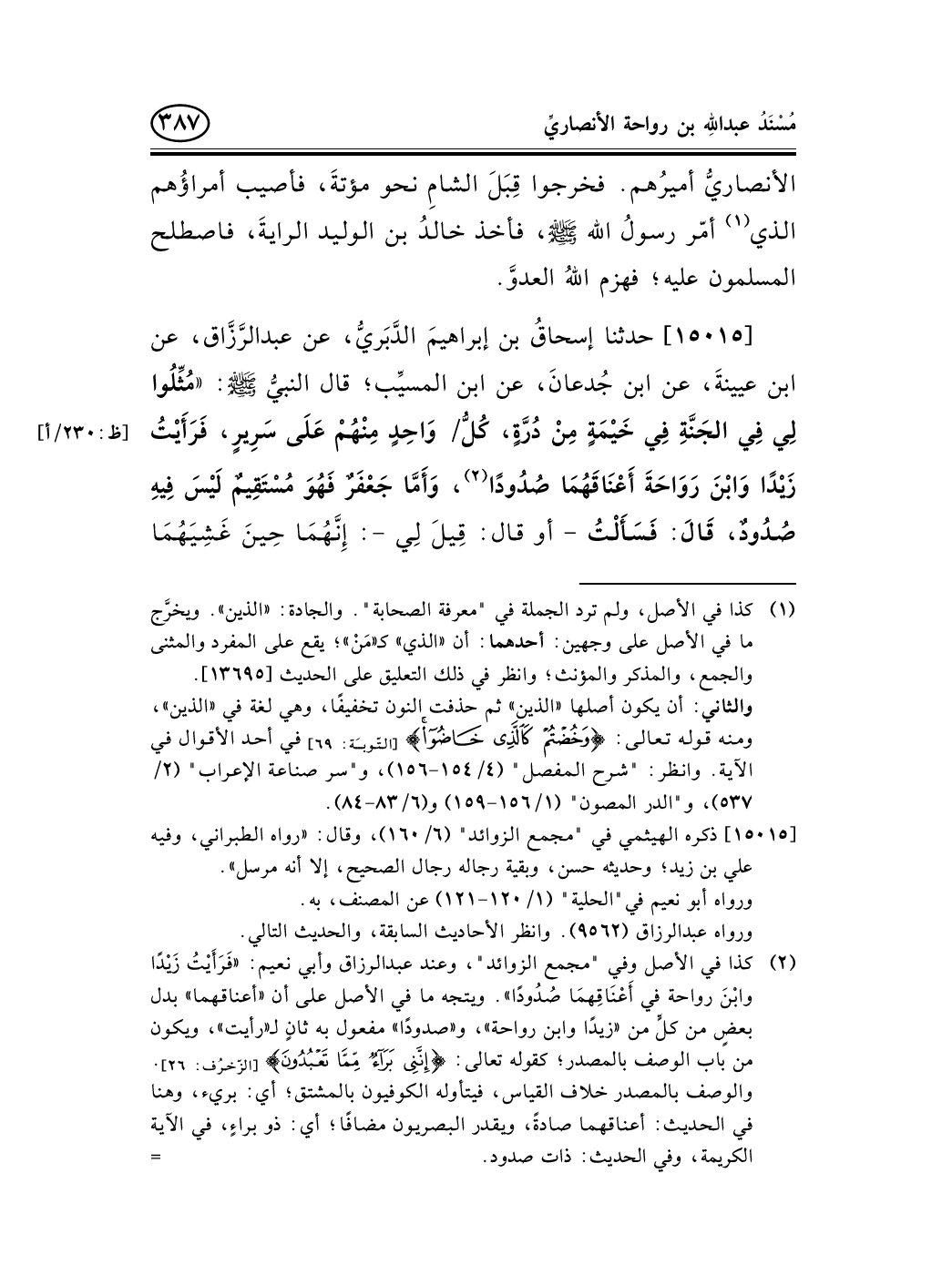 (¬1) كذا في الأصل وفي "مجمع الزوائد"، وعند عبد الرزاق وأبي نعيم: «فَرَأَيْتُ زَيْدًا وابْنَ رواحة في أَعْنَاقِهمَا صُدُودًا» . ويتجه ما في الأصل على أن «أعناقهما» بدل بعضٍ من كلٍّ من «زيدًا وابن رواحة» ، و «صدودًا» مفعول به ثانٍ لـ «رأيت» ، ويكون من باب الوصف بالمصدر؛ كقوله تعالى: {إِنَّنِي بَرَاءٌ مِمَّا تَعْبُدُونَ} [الزّخرُف: 26] . والوصف بالمصدر خلاف القياس، فيتأوله الكوفيون بالمشتق؛ أي: بريء، وهنا في الحديث: أعناقهما صادةً، ويقدر البصريون مضافًا؛ أي: ذو براءٍ، في الآية الكريمة، وفي الحديث: ذات صدود. -[388]-