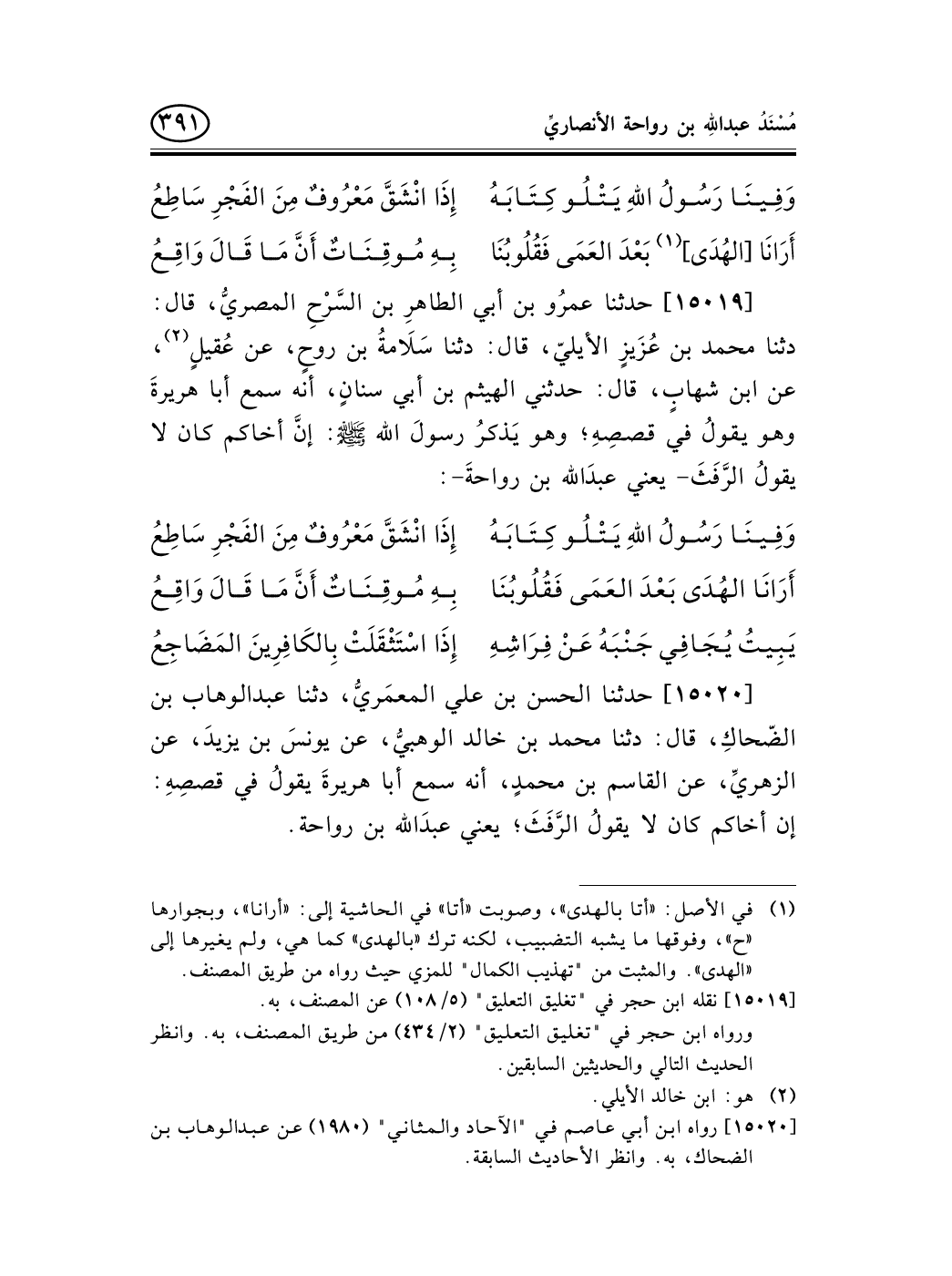 15019 - حدثنا عمرُو بن أبي الطاهرِ بن السَّرْحِ المصريُّ، قال: دثنا محمد بن عُزَيزٍ الأيليّ، قال: دثنا سَلاَمةُ بن روحٍ، عن عُقيلٍ (¬1) ، عن ابن شهابٍ، قال: حدثني الهيثم بن أبي سنانٍ، أنه سمع أبا هريرةَ وهو يقولُ في قصصِهِ؛ وهو يَذكرُ رسولَ الله صلى الله عليه وسلم: إنَّ أخاكم كان لا يقولُ الرَّفَثَ- يعني عبدَالله بن رواحةَ-: