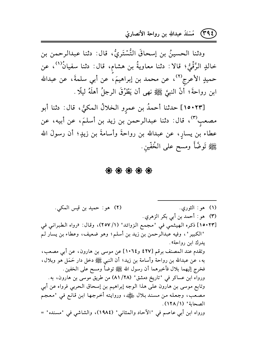 15023 - حدثنا أحمدُ بن عمرٍو الخلالُ المكيُّ، قال: دثنا أبو مصعبٍ (¬1) ، قال: دثنا عبد الرحمن بن زيد بن أسلمَ، عن أبيه، عن عطاء بن يسارٍ، عن عبد الله بن رواحةَ وأسامةَ بن زيدٍ؛ أن رسولَ الله صلى الله عليه وسلم تَوضَّأَ ومسح على الخُفّينِ.