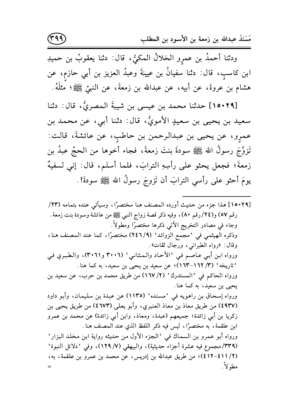 15029 - حدثنا محمد بن عيسى بن شيبةَ المصريُّ، قال: دثنا سعيد بن يحيى بن سعيدٍ الأمويُّ، قال: دثنا أبي، عن محمد بن عمرٍو، عن يحيى بن عبد الرحمن بن حاطبٍ، عن عائشةَ، قالت: تَزوَّجَ رسولُ الله صلى الله عليه وسلم سودةَ بنتَ زمعةَ، فجاء أخوها من الحجِّ عبدُ بن زمعةَ؛ فجعل يحثو على رأسِهِ الترابَ، فلما أسلم، قال: إني لسفيهٌ يومَ أحثو على رأسي الترابَ أن تَزوجَ رسولُ الله صلى الله عليه وسلم سودةَ!.