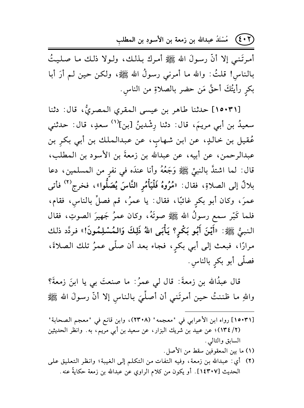 15031 - حدثنا طاهر بن عيسى المقري المصريُّ، قال: دثنا سعيدُ بن أبي مريمَ، قال: دثنا رِشْدينُ [بن] (¬1) سعدٍ، قال: حدثني عُقيل بن خالدٍ، عن ابن شهابٍ، عن عبد الملك بن أبي بكرِ بن عبد الرحمن، عن أبيه، عن عبد الله بن زمعةَ بن الأسود بن المطلب، قال: لما اشتدَّ بالنبيِّ صلى الله عليه وسلم وَجَعُهُ وأنا عندَه في نفرٍ من المسلمين، دعا بلالٌ إلى الصلاةِ، فقال: «مُرُوهُ فَلْيَأْمُرِ النَّاسَ يُصَلُّوا» ، فخرج (¬2) فأتى عمرَ، وكان أبو بكرٍ غائبًا، فقال: يا عمرُ، قم فصلِّ بالناسِ، فقام، فلما كَبّر سمع رسولُ الله صلى الله عليه وسلم صوتَهُ، وكان عمرُ جَهيرَ الصوتِ، فقال النبيُّ صلى الله عليه وسلم: «أَيْنَ أَبُو بَكْرٍ؟ يَأْبَى اللهُ ذَلِكَ وَالمُسْلِمُونَ!» فردَّد ذلك مرارًا، فبعث إلى أبي بكرٍ، فجاء بعد أن صلّى عمرُ تلك الصلاةَ، فصلّى أبو بكرٍ بالناسِ.