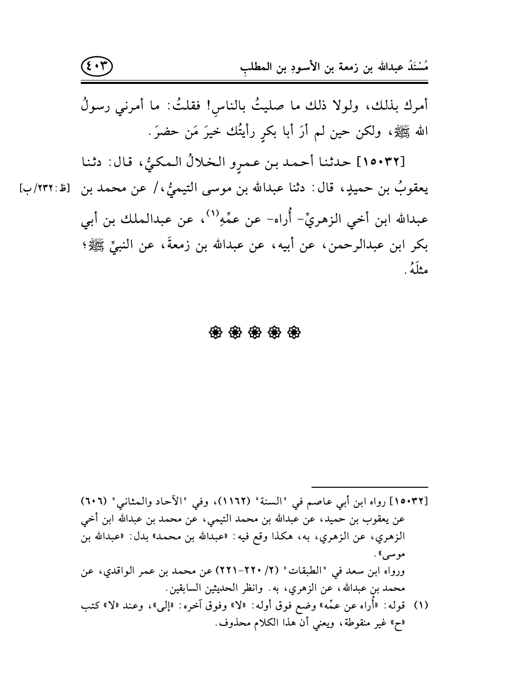 15032 - حدثنا أحمد بن عمرٍو الخلالُ المكيُّ، قال: دثنا يعقوبُ بن حميدٍ، قال: دثنا عبد الله بن موسى التيميُّ، / عن محمد بن [ظ: 232/ب] عبد الله ابن أخي الزهريِّ- أُراه- عن عمِّهِ (¬1) ، عن عبد الملك بن أبي بكر ابن عبد الرحمن، عن أبيه، عن عبد الله بن زمعةَ، عن النبيِّ صلى الله عليه وسلم؛ مثلَهُ.