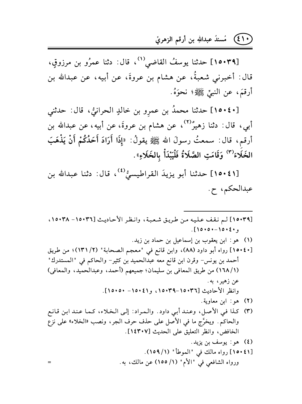 15040 - حدثنا محمدُ بن عمرِو بن خالدٍ الحرانيُّ، قال: حدثني أبي، قال: دثنا زهيرٌ (¬1) ، عن هشام بن عروةَ، عن أبيه، عن عبد الله بن أرقمِ، قال: سمعتُ رسولَ الله صلى الله عليه وسلم يقولُ: «إِذَا أَرَادَ أَحَدُكُمْ أَنْ يَذْهَبَ الخَلاَءَ (¬2) وَقَامَتِ الصَّلاَةُ فَلْيَبْدَأْ بِالخَلاَءِ» .