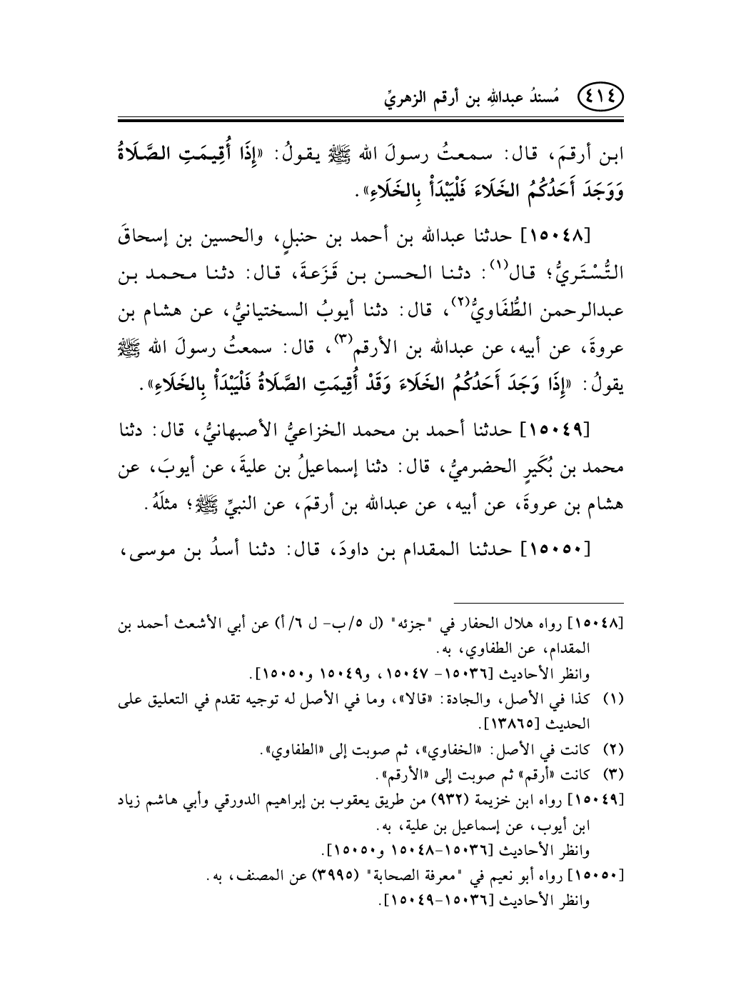 15048 - حدثنا عبد الله بن أحمد بن حنبلٍ، والحسين بن إسحاقَ التُّسْتَريُّ؛ قال (¬1) : دثنا الحسن بن قَزَعةَ، قال: دثنا محمد بن عبد الرحمن الطُّفَاويُّ (¬2) ، قال: دثنا أيوبُ السختيانيُّ، عن هشام بن عروةَ، عن أبيه، عن عبد الله بن الأرقم (¬3) ، قال: سمعتُ رسولَ الله صلى الله عليه وسلم يقولُ: «إِذَا وَجَدَ أَحَدُكُمُ الخَلاَءَ وَقَدْ أُقِيمَتِ الصَّلاَةُ فَلْيَبْدَأْ بِالخَلاَءِ» .