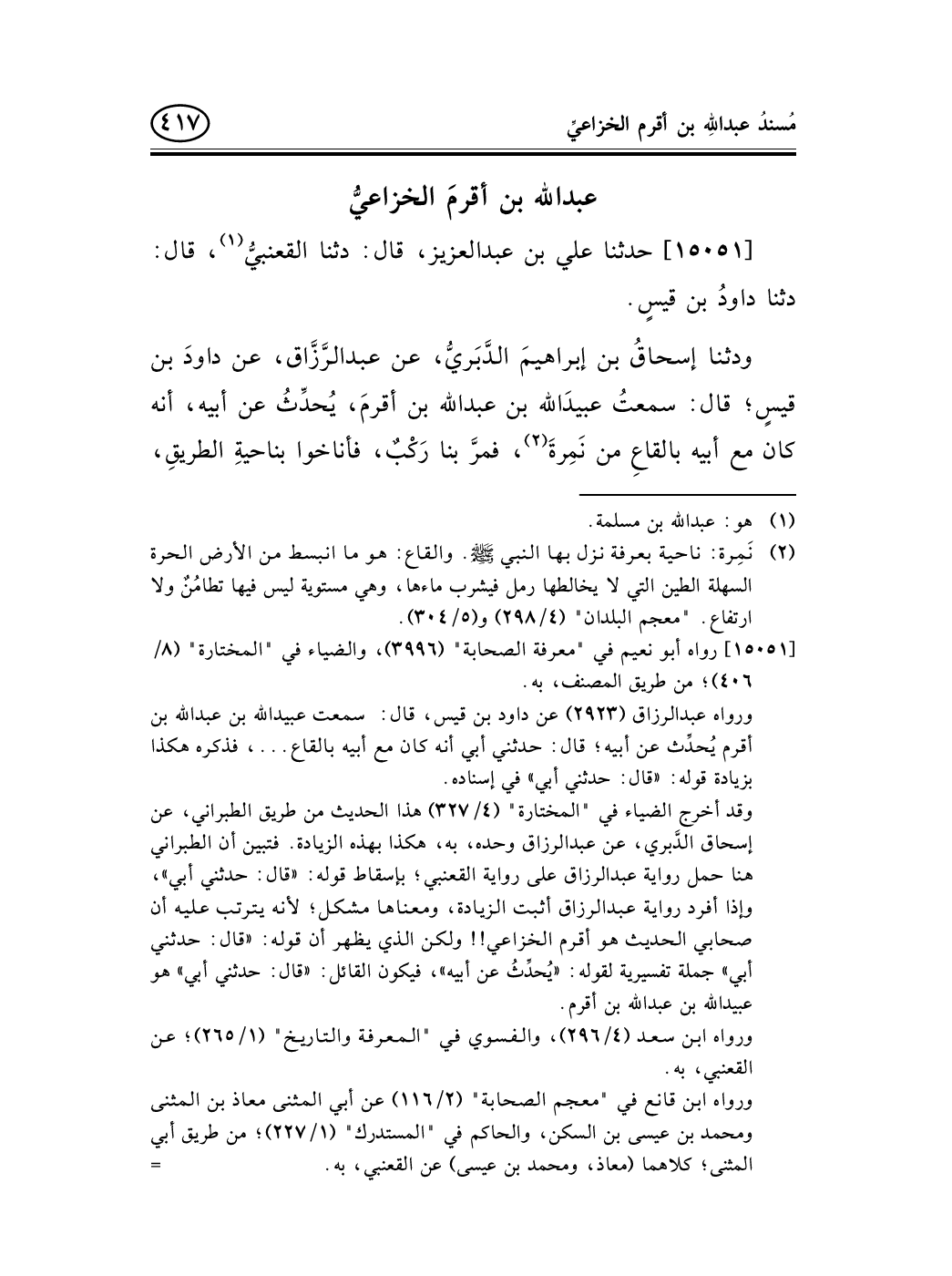 ورواه عبد الرزاق (2923) عن داود بن قيس، قال: سمعت عبيد الله بن عبد الله بن أقرم يُحدِّث عن أبيه؛ قال: حدثني أبي أنه كان مع أبيه بالقاع ... ، فذكره هكذا بزيادة قوله: «قال: حدثني أبي» في إسناده.