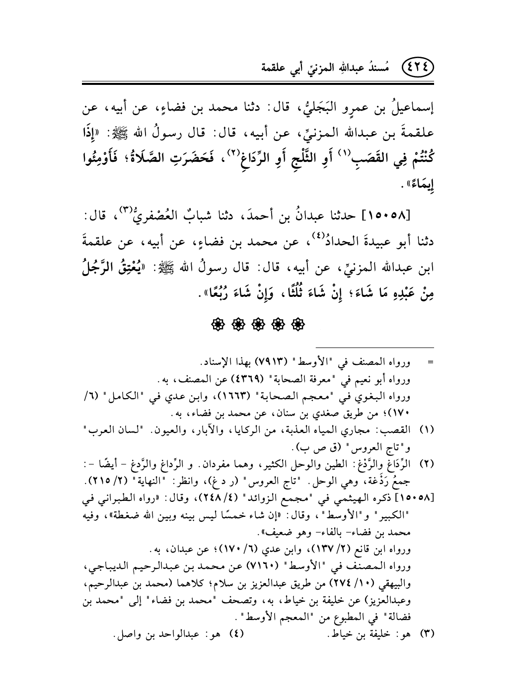 15058 - حدثنا عبدانُ بن أحمدَ، دثنا شبابٌ العُصْفريُّ (¬1) ، قال: دثنا أبو عبيدةَ الحدادُ (¬2) ، عن محمد بن فضاءٍ، عن أبيه، عن علقمةَ ابن عبد الله المزنيِّ، عن أبيه، قال: قال رسولُ الله صلى الله عليه وسلم: «يُعْتِقُ الرَّجُلُ مِنْ عَبْدِهِ مَا شَاءَ؛ إِنْ شَاءَ ثُلُثًا، وَإِنْ شَاءَ رُبُعًا» .